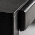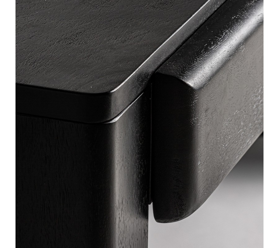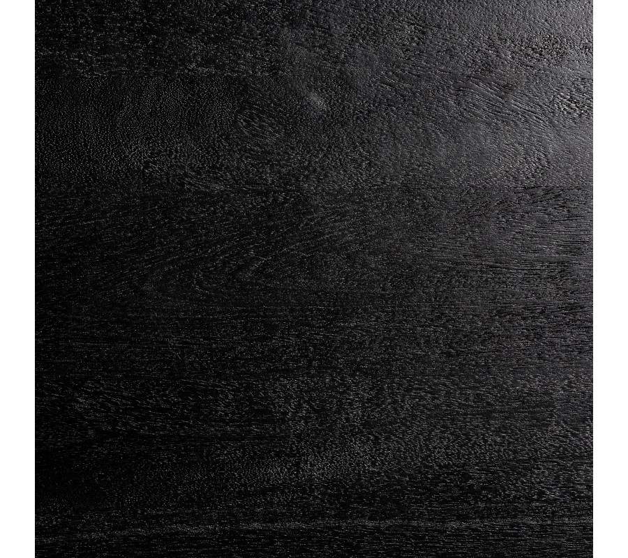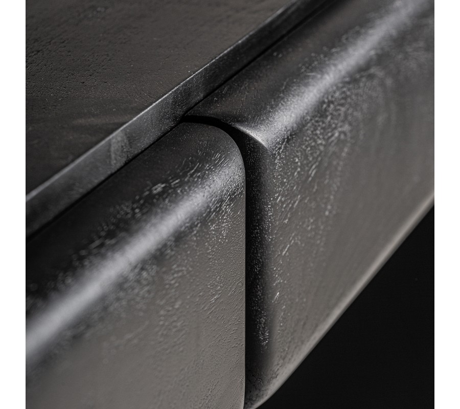 Je vyrobený z masívneho mangového dreva, ktorého prírodná štruktúra letokruhov je viditeľná na hladkých povrchoch. Stôl má jednoduchý hranatý tvar a vrchná doska prechádza do plných bočných strán. Určite oceníte aj praktický úložný priestor v podobe dvoch zásuviek umiestnených pod vrchnou doskou. Ich predná strana je tvorená hrubými doskami so zaoblenými hranami. Tento minimalistický detail prináša do dizajnu zaujímavý vizuálny prvok, ktorý kontrastuje s inak rovnými líniami nábytku.
