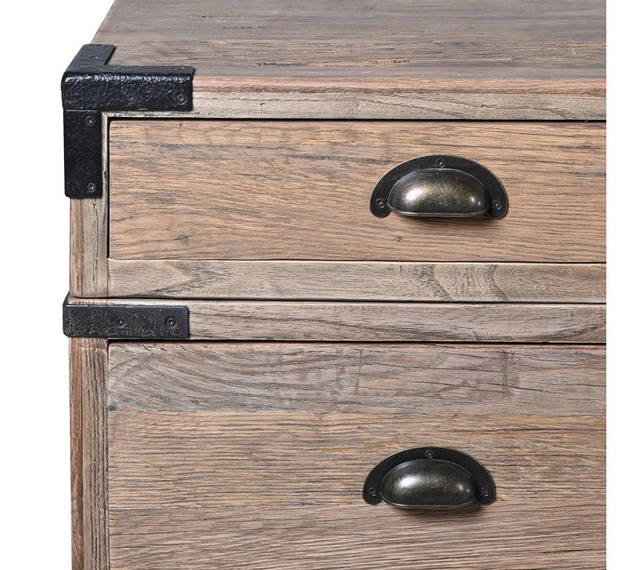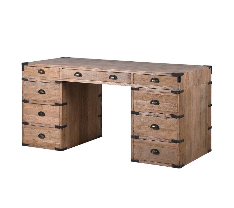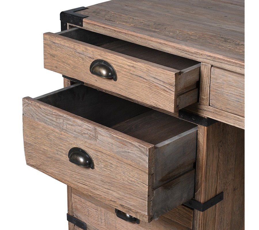 Písací stôl Ruma má obdĺžnikový tvar s dvomi stabilnými podstavami po stranách a stredovým priestorom na nohy. Je vyrobený z dubového dreva s výraznou prírodnou štruktúrou letokruhov v svetlohnedom odtieni. Obsahuje celkovo 9 zásuviek, 4 na každej strane a jednu v strede pod pracovnou doskou. Zásuvky sú vybavené čiernymi kovovými úchytkami, ktoré dodávajú praktickosť a estetický kontrast. Rohy sú zosilnené kovovými detailmi v čiernej farbe, čo zvyšuje dojem robustnosti.
