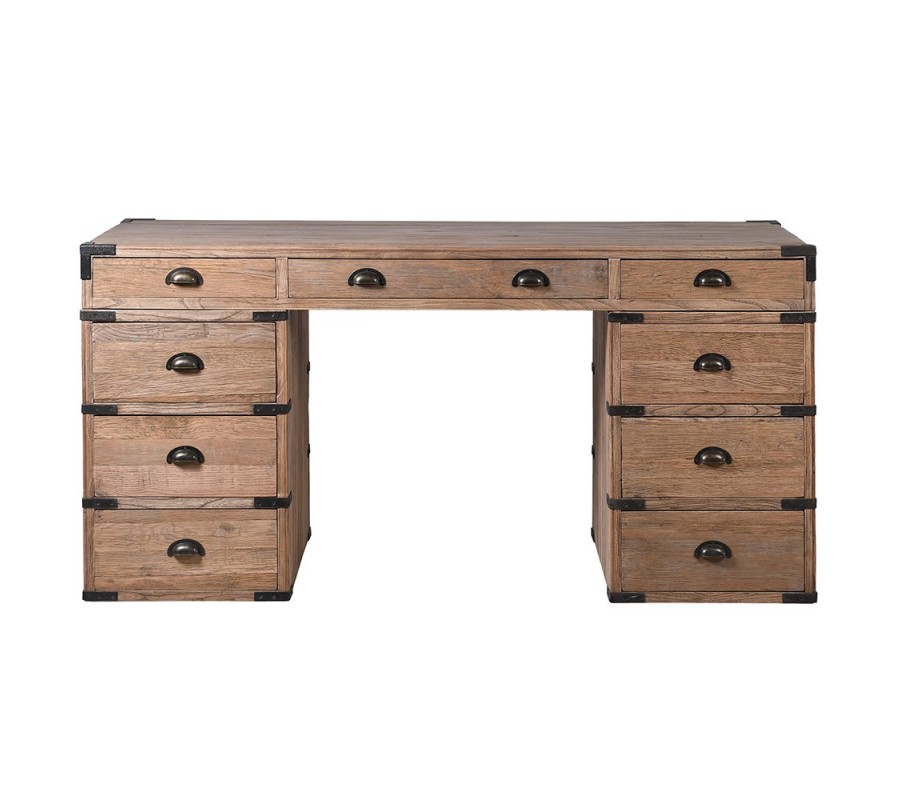 Luxusný rustikálny masívny písací stôl Ruma v hnedej farbe s deviatimi zásuvkami a čiernymi kovovými dekoráciami 160 cm