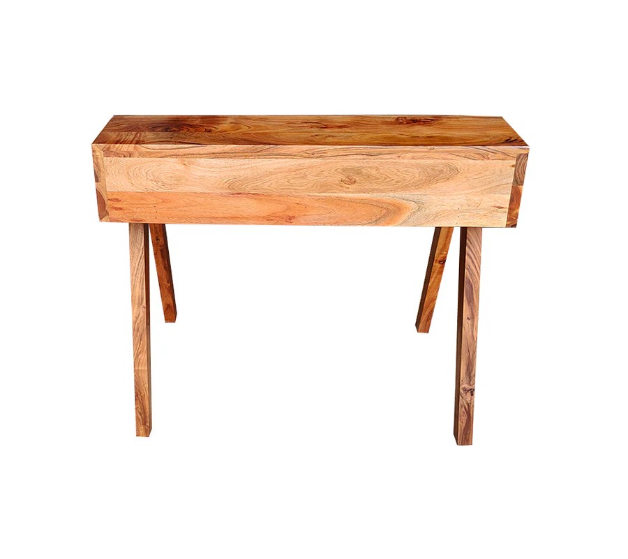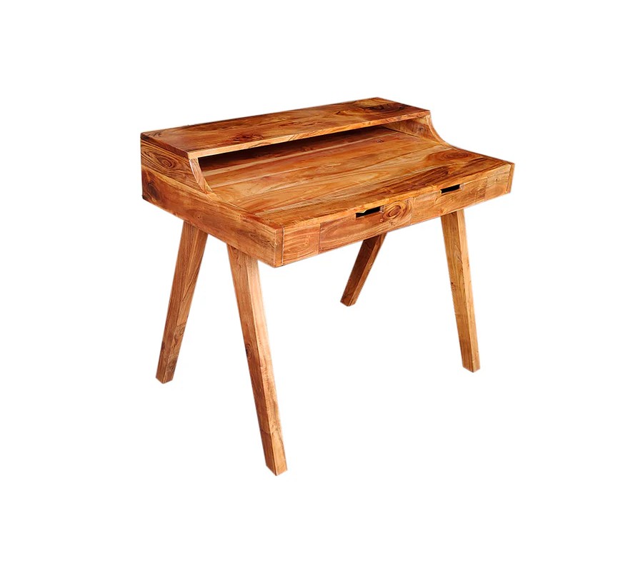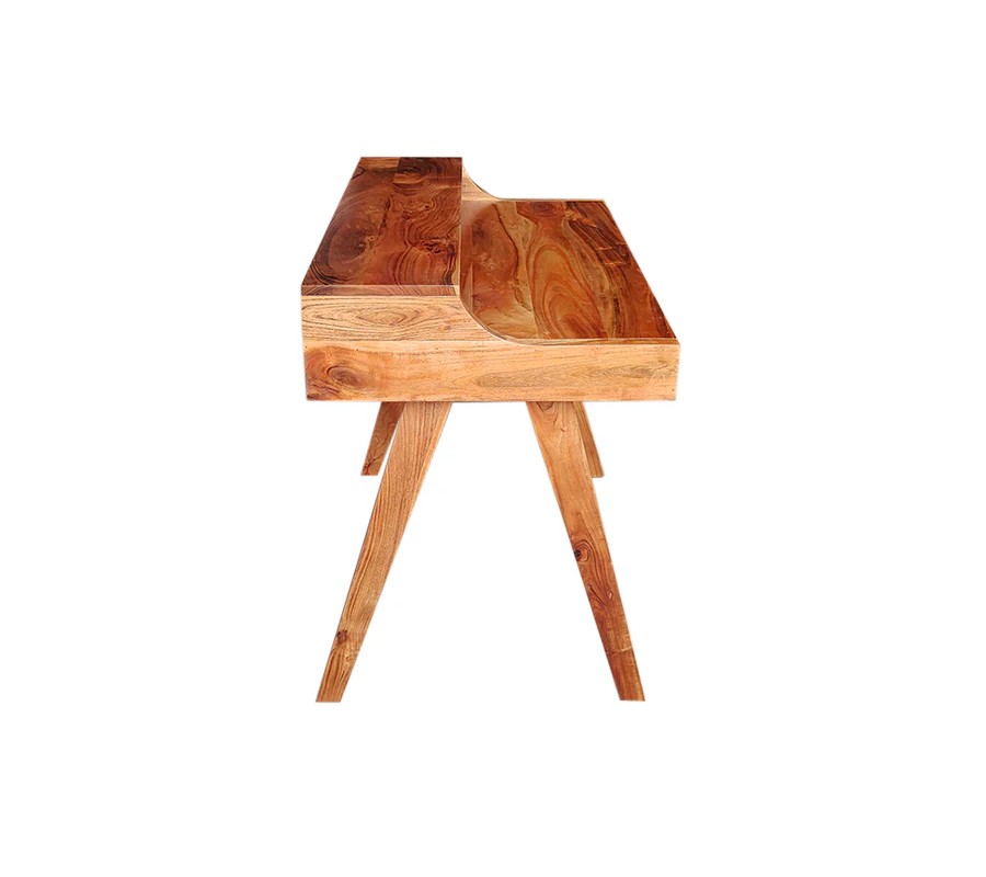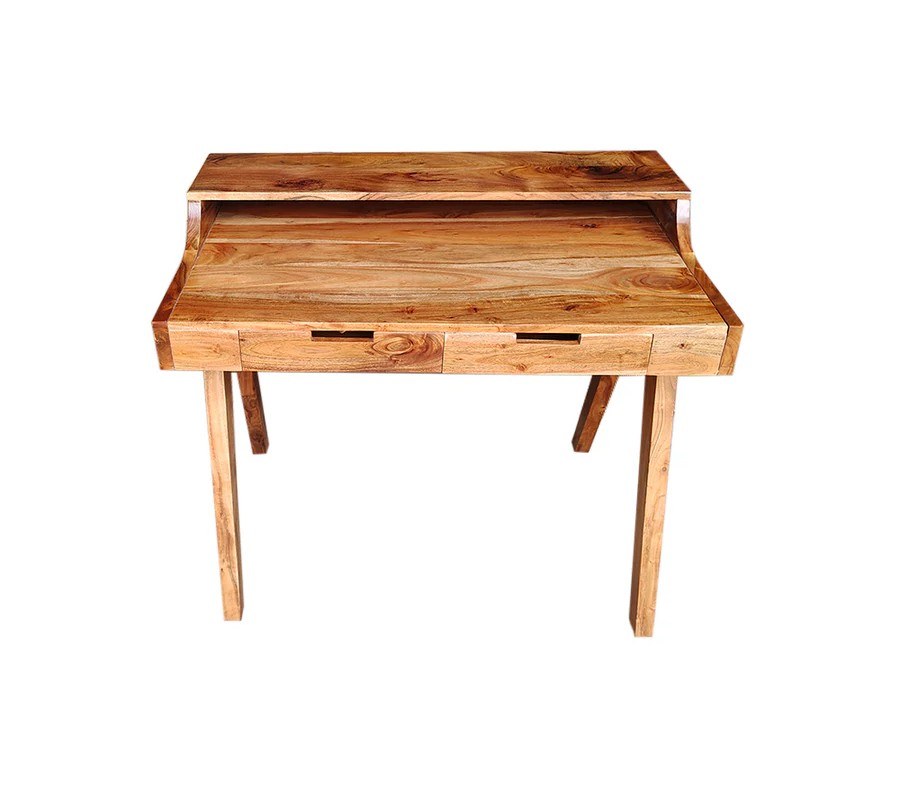 Písací stolík je vyrobený z kvalitného akáciového dreva, ktoré vyniká svojou prirodzenou kresbou a teplým hnedým odtieňom. Tvar stolíka je obdĺžnikový so zaoblenou bočnou hranou poličky, ktorá poskytuje jemný a originálny vzhľad. Disponuje dvomi praktickými zásuvkami na uskladnenie kancelárskych potrieb alebo drobností, pričom ich úchyty sú decentne zakomponované do dizajnu.