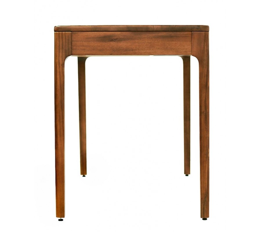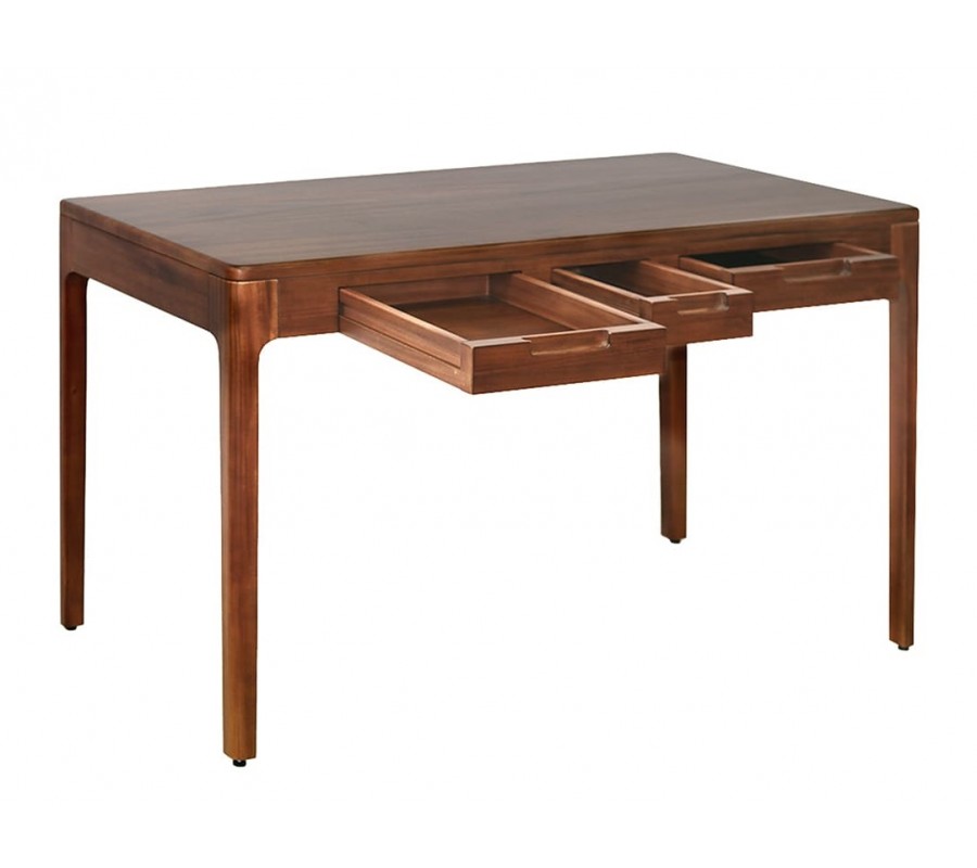 Písací stôl má obdĺžnikovú vrchnú dosku, umiestnenú na štyroch štíhlych nožičkách. Silueta kombinuje jednoduché rovné línie s elegantnými krivkami a nábytok tak pôsobí moderným dojmom. Pod vrchnou doskou sú vedľa seba umiestnené tri nízke zásuvky, ideálne na písacie potreby či dôležité drobnosti. Stredová zásuvka je užšia a na stranách sa nachádzajú dve širšie. Otvárajú sa pomocou obdĺžnikového výrezu vo vrchnej časti, ktorý svojimi zaoblenými rohmi korešponduje s elegantnými tvarmi nábytku a zároveň zachováva minimalistický vizuál.