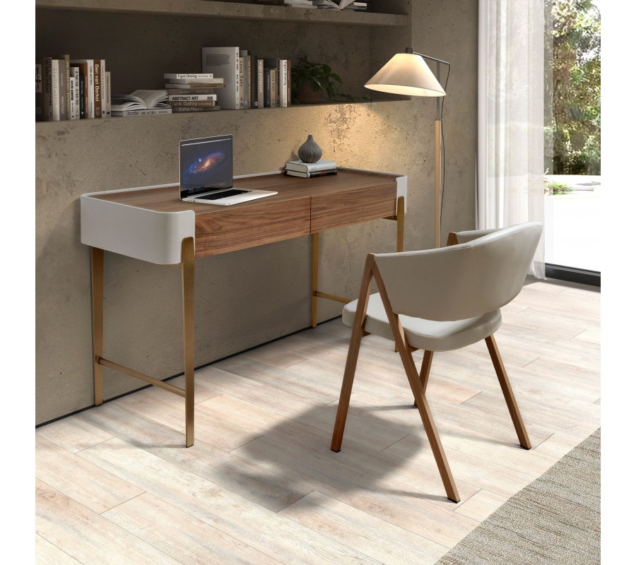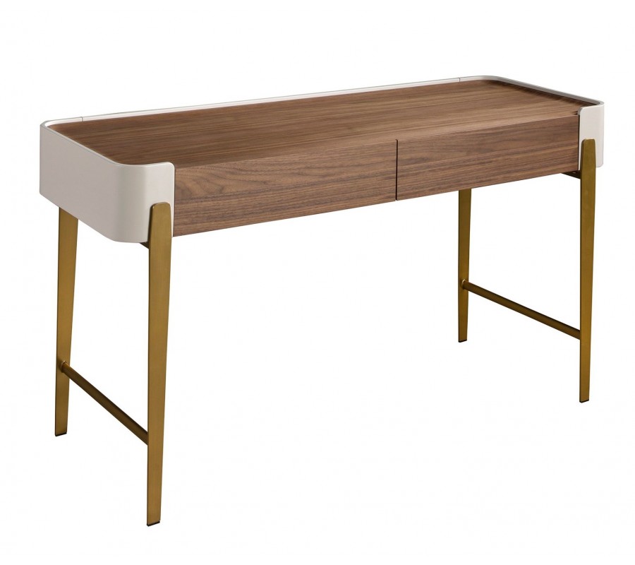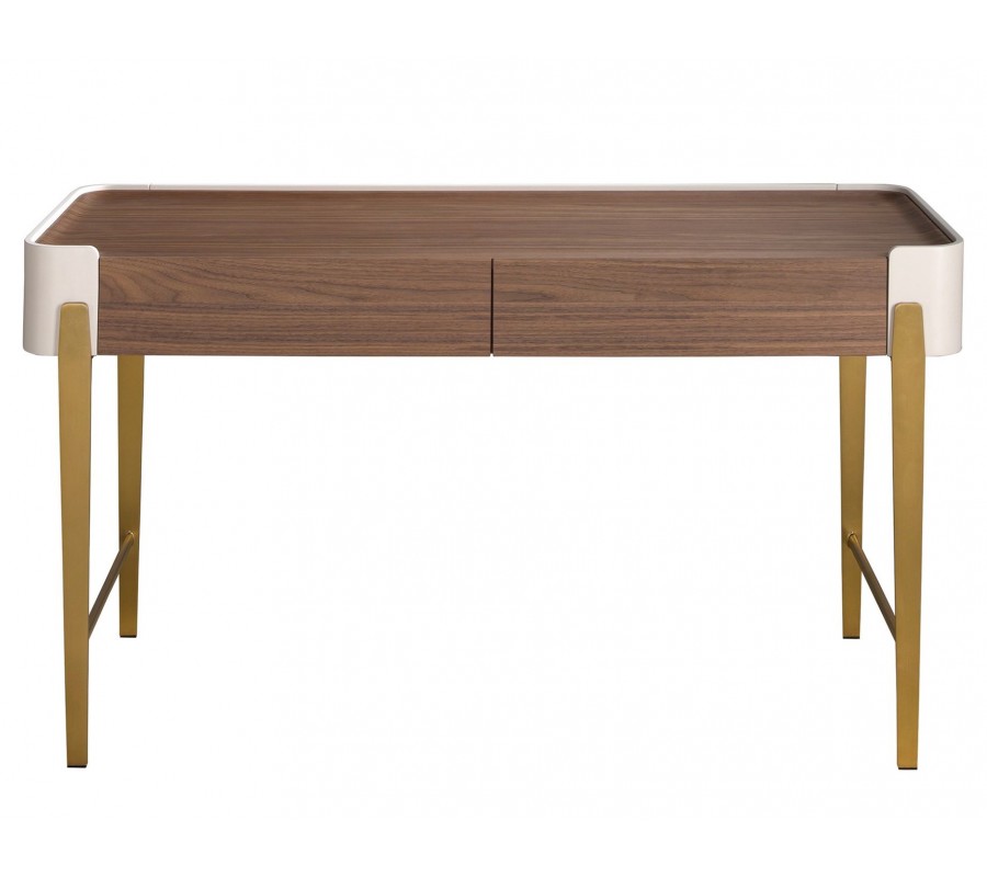 Luxusný moderný písací stôl Forma Moderna s dvomi zásuvkami v kombinácii béžovej a orechovej hnedej so zlatou podstavou 140 cm