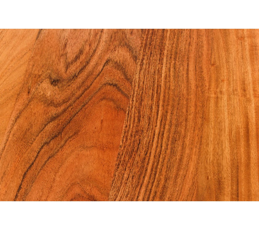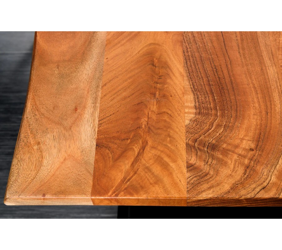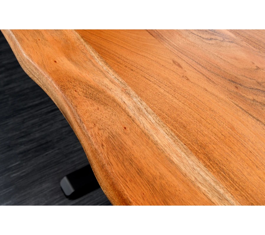 Nábytku dominuje obdĺžniková vrchná doska, vyrobená z masívneho akáciového dreva. Jej kratšie hrany sú rovno zrezané, zatiaľ čo tie dlhšie sú organicky zvlnené a sledujú prirodzenú štruktúru dreva. Naturálna medovo hnedá farba pôsobí teplým dojmom a výrazná kresba letokruhov dodáva nábytku subtílny dekoračný element.