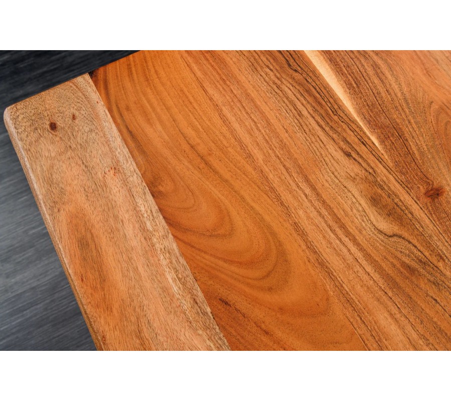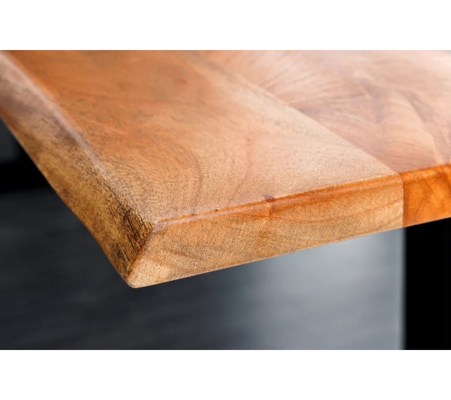 Vrchná doska je vyrobená z masívneho akáciového dreva v krásnej medovej hnedej farbe. Dopĺňa ju priznaná kresba letokruhov a naturálny vizuál završujú organicky zvlnené dlhšie hrany stola, sledujúce organickú štruktúru dreva. Kratšie hrany sú zrezané dorovna a dĺžka 180 cm vám poskytuje bohatý pracovný priestor.