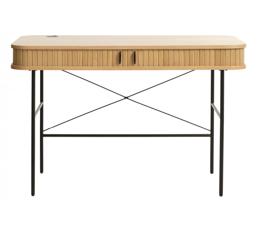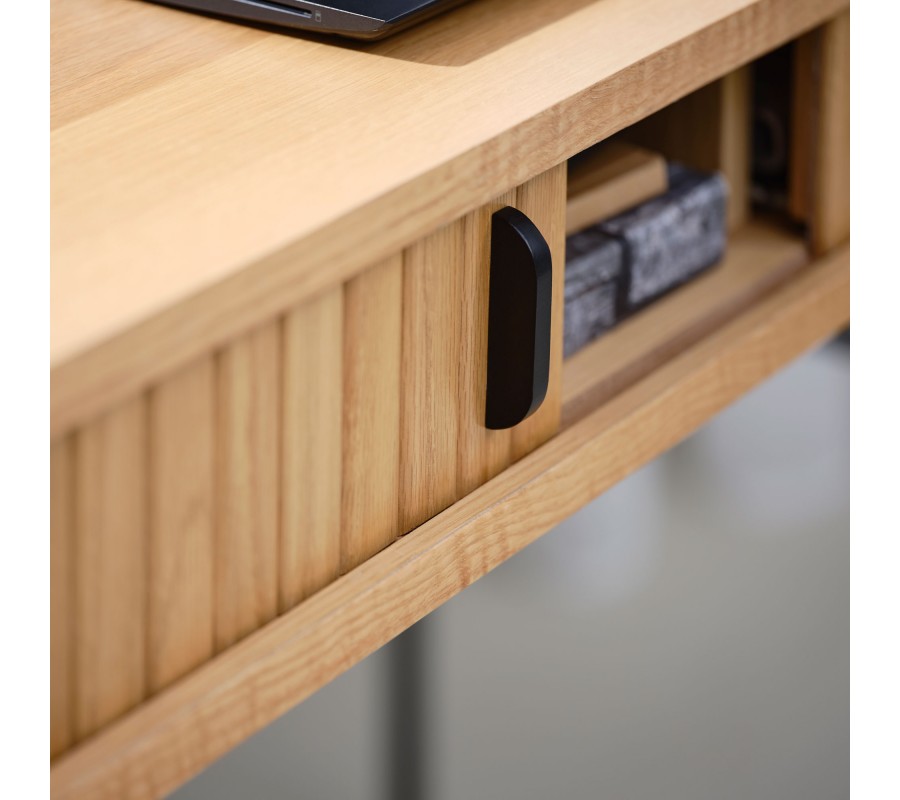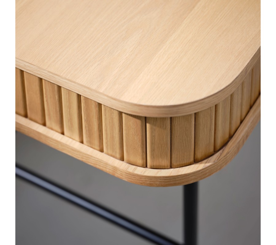 Stôl má obdĺžnikovú vrchnú dosku so zaoblenými rohmi a hladkým povrchom, na ktorom vyniká štruktúra dreva. V ľavom rohu ju dopĺňa praktický otvor na vedenie káblov. Pod doskou sa nachádza uzatvárateľný úložný priestor s dvomi posuvnými dvierkami, ktoré v kombinácii s vertikálnym lamelovým dekorom odkazujú na inšpiráciu retro štýlom.