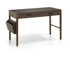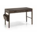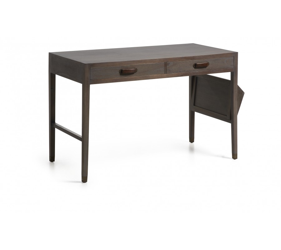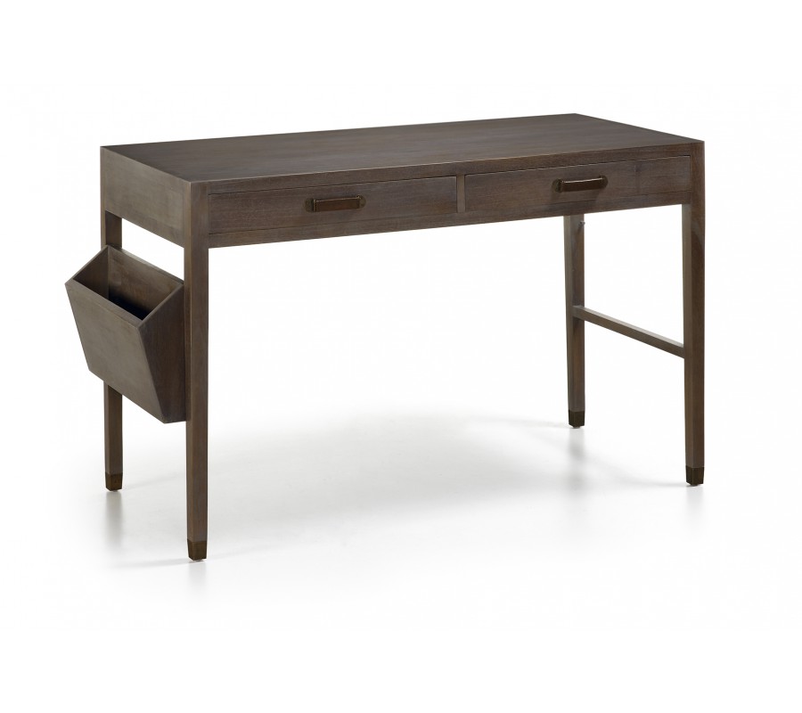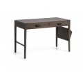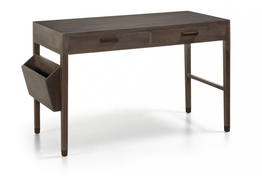 Luxusný štýlový písací stolík s poličkou na noviny z kolekcie nábytku SPARTAN je vyrobený z masívneho dreva MINDI, hnedo-modro-čierneho výrazu, podobného drevu WENGE. Štýl kolekcie odrzkadluje sedemdesiate roky. Tento nábytok v RETRO štýle má úchyty z tvrdej kože hnedej farby.