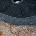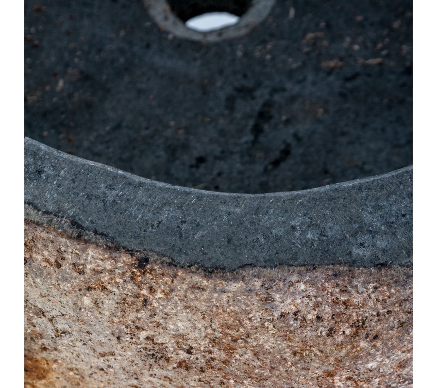 Vnútorná časť umývadla je vybrúsená do hladka a ošetrená lesklou čiernou vrstvou, ktorá zaručuje vysokú odolnosť voči vode a zároveň vytvára elegantný kontrast k surovému povrchu. Umývadlo je navrhnuté ako samostatne stojaci kus, so zadnou výrezovou časťou, ktorá umožňuje jednoduché napojenie na odpad a vedenie vody.