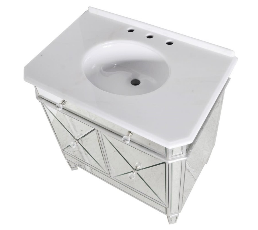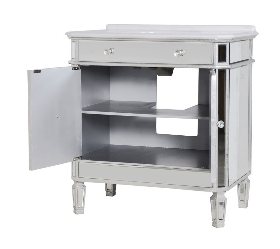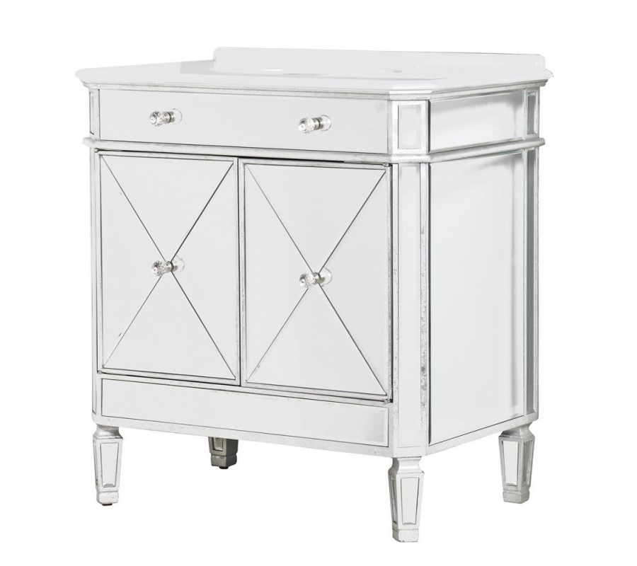 Luxusná umývadlová skrinka Granada zaujme vďaka svojmu modernému zrkadlovému dizajnu. Je vyrobená z dreveného materiálu a skla so zrkadlovým efektom, pričom je doplnená o strieborné úchyty. Povrchová doska sa nesie v bielej farbe a zrkadlový efekt na dvierkach i zásuvke dotvára štýlový art-deco vzhľad. Zaujímavé sú tiež zrezané rohy skrinky tvoriace šikmú plochu, ktorú následne dopĺňajú štýlové nožičky. Skrinka Granada disponuje praktickou zásuvkou a dvierkami poskytujúcimi bohatý úložný priestor. Vynikne predovšetkým v moderných či art-deco kúpeľniach.