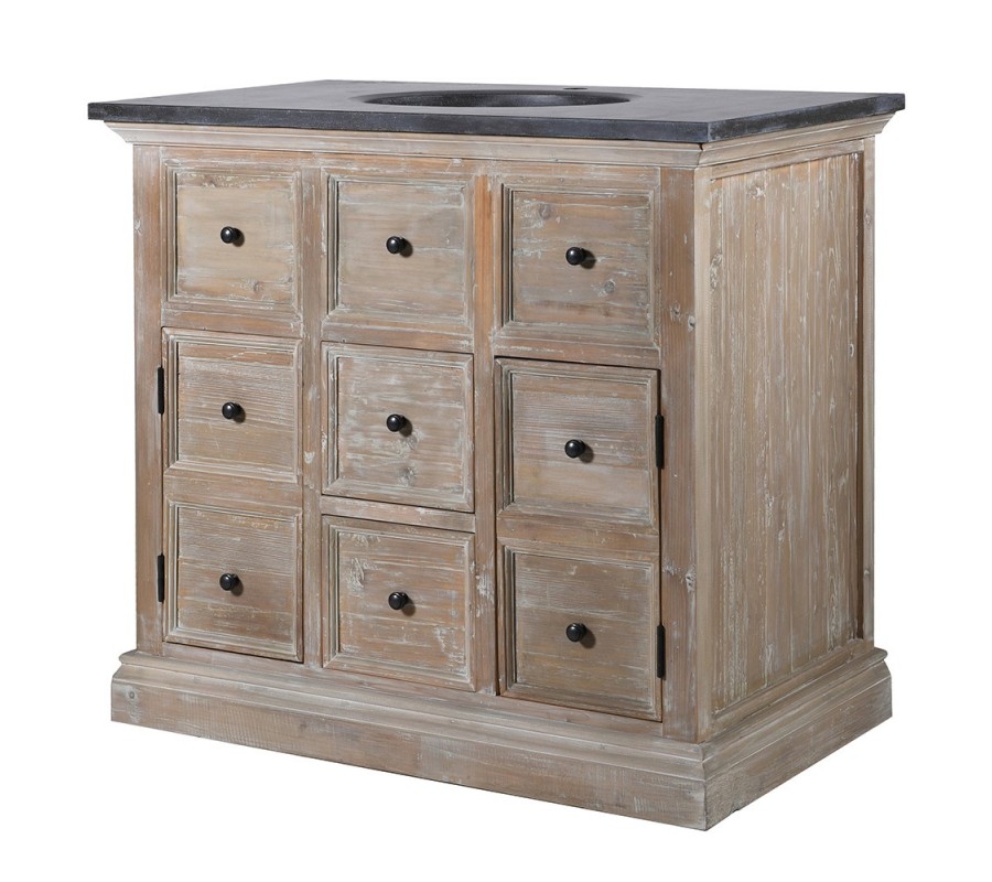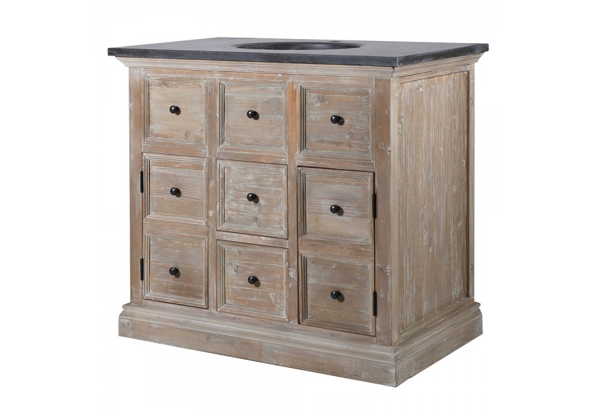 Vidiecka štýlová kúpeľňova skrinka je vyrobená z masívneho borovicoveho dreva. Je povrchovo upravená tak, aby sa zvýraznila unikátna štruktúra dreva na jej povrchu v kombinácii so svetlo šedými farbami, toto spracovanie sa nazýva washed effect. Je doplnená o dvoje dvierka, ktoré zapadajú s výzorom šuflíkov a tak dodávajú jednotný dizajn. Spolu s dvoma dvierkami sa tu nachádza päť šuflíkov, ktoré sú doplnené o dizajnové čierne kovanie vo forme rúčok. Dominantou celej skrinky je veľká čierna mramorová doska, ktorá je vode odolná a ľahko udržateľná. Mramorová doska disponuje predpripraveným keramickým umývadlom. Batériu odporúčame použiť vo vintage štýle, ktorá vkusne doplní dizajn celej skrinky.