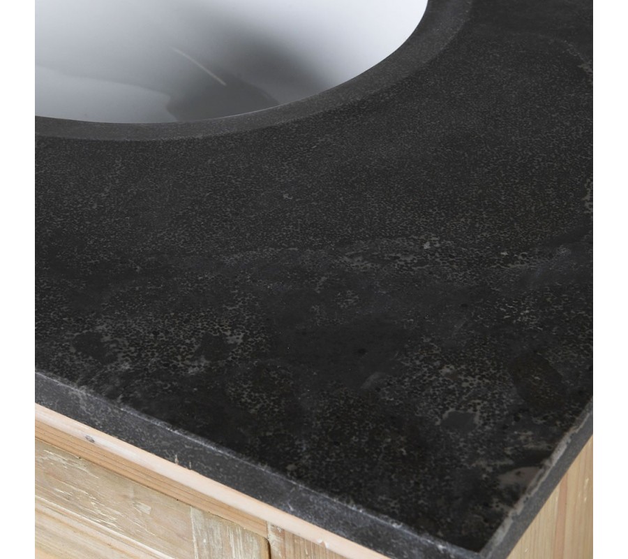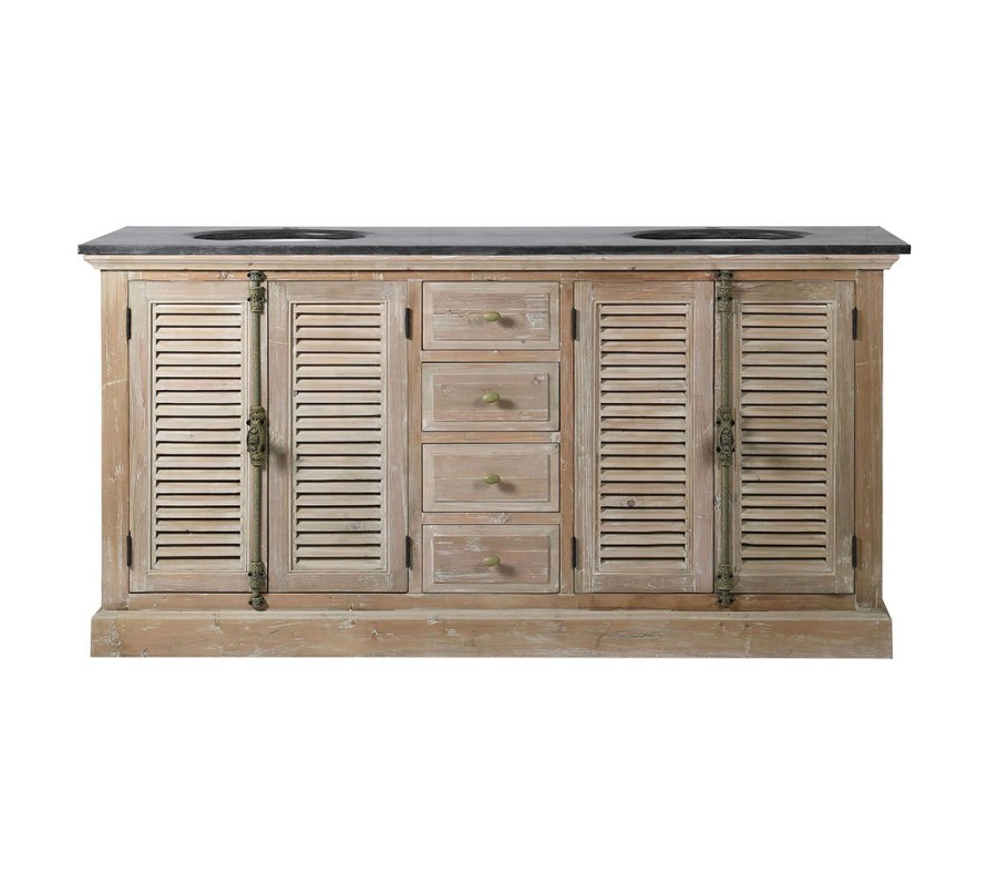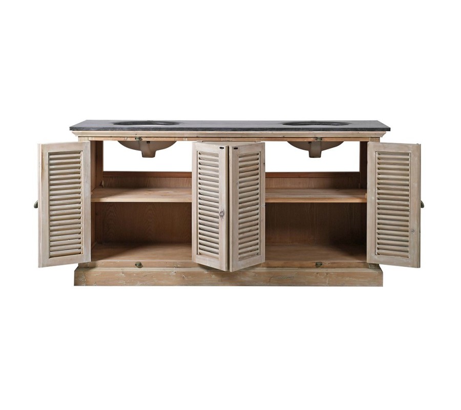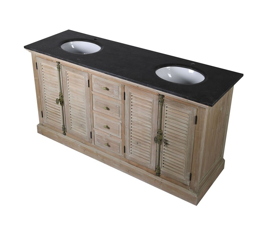 Masívna vidiecka kúpeľnová skrinka Polly z borovicového dreva s dvoma umývadlami a čiernou mramorovou doskou 180cm