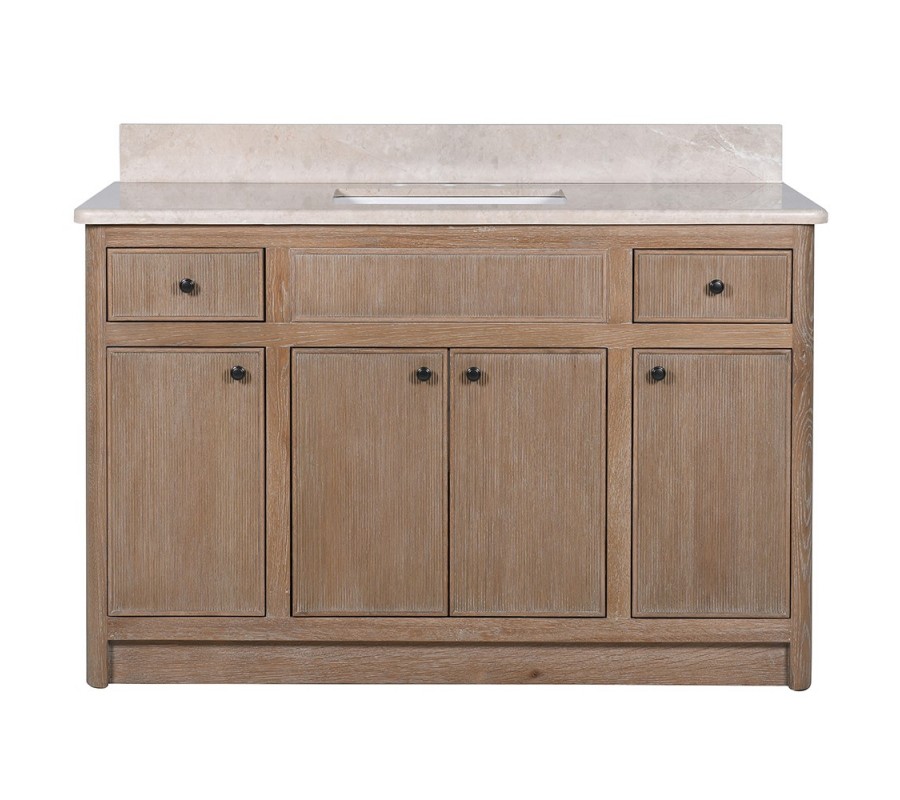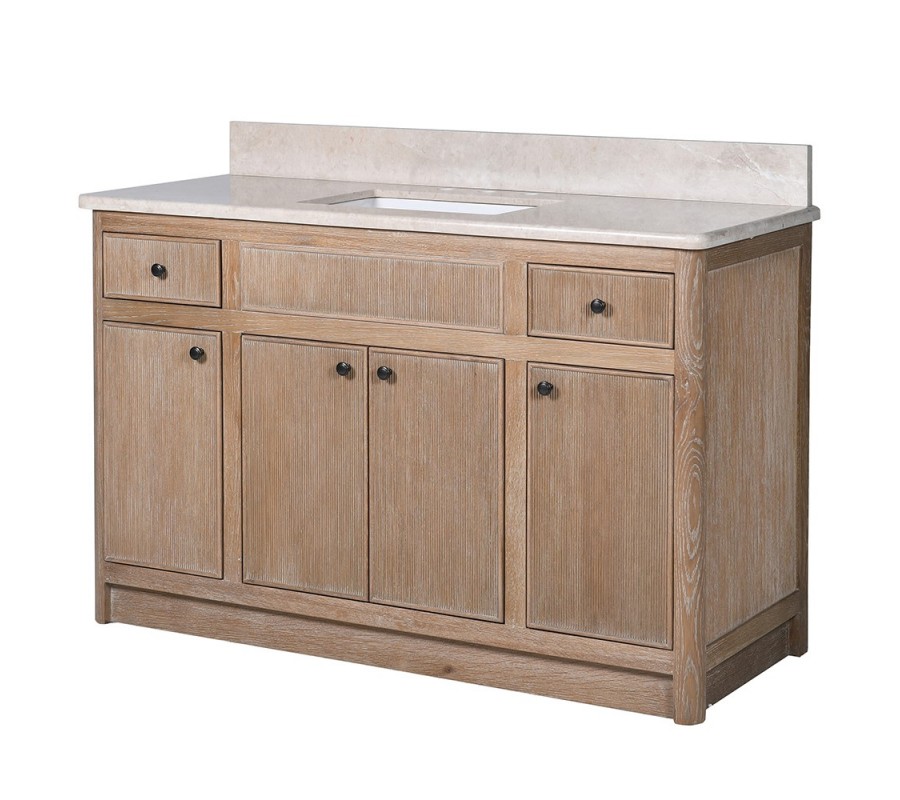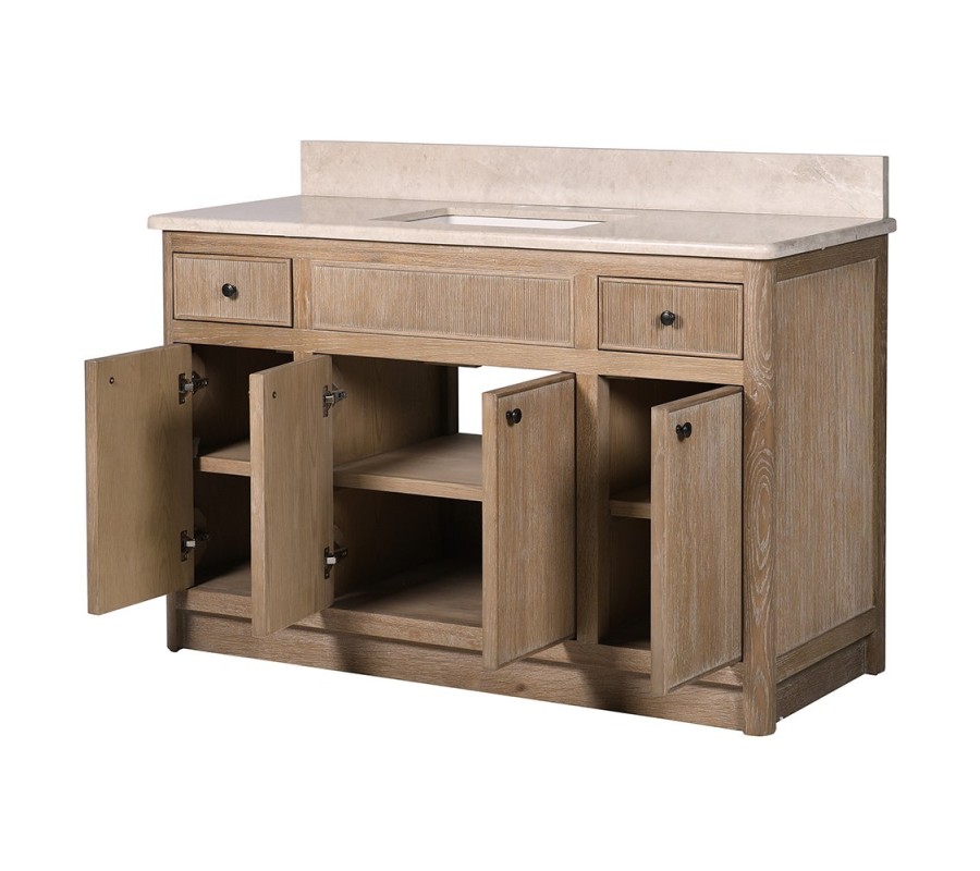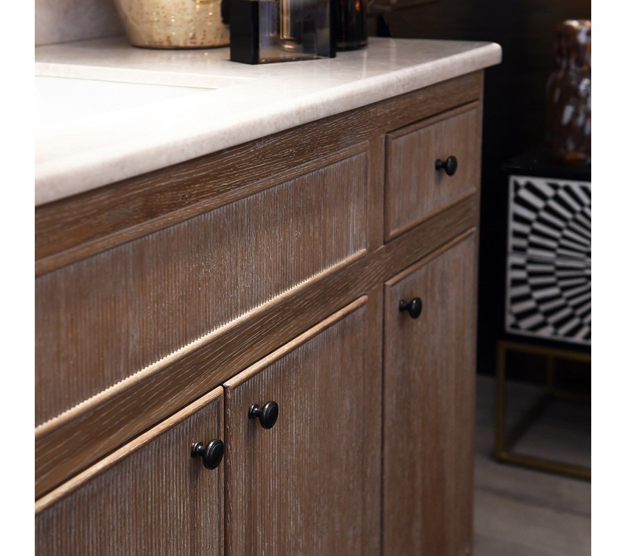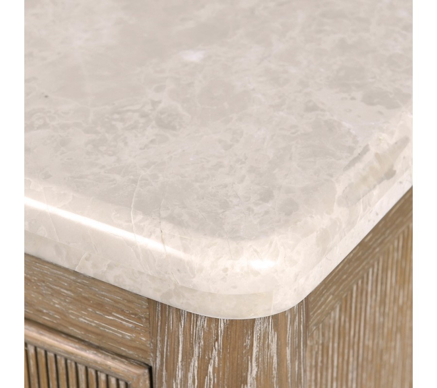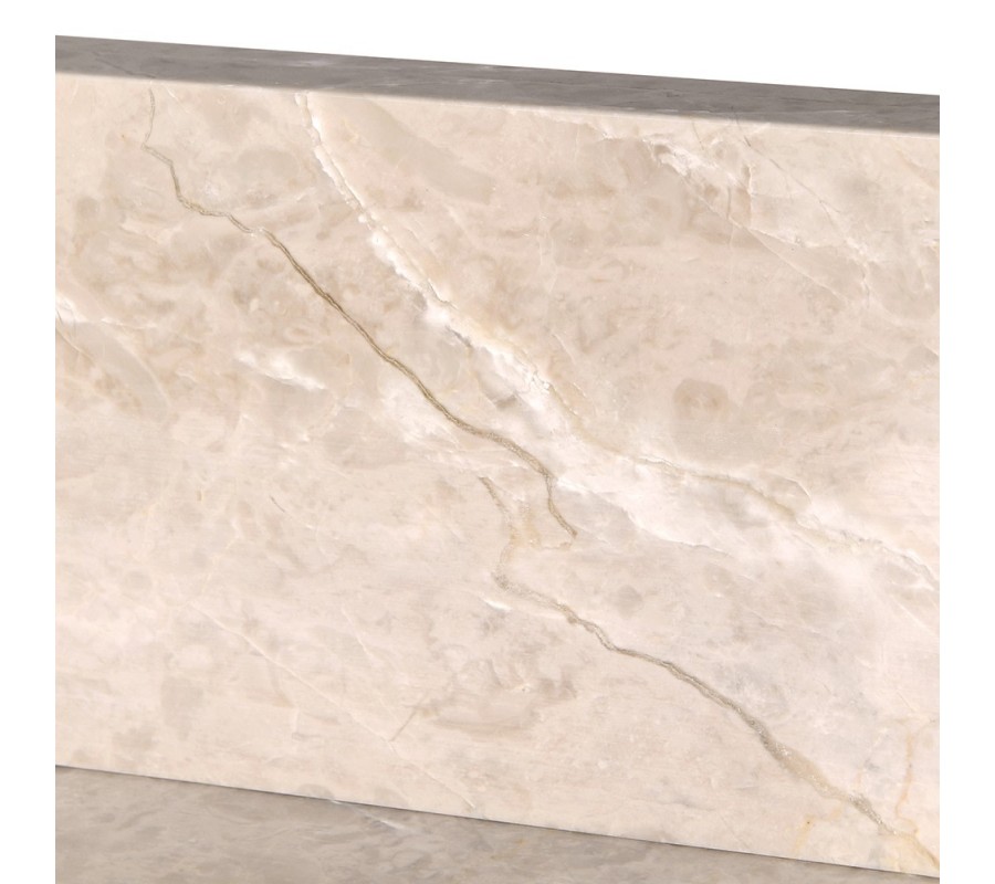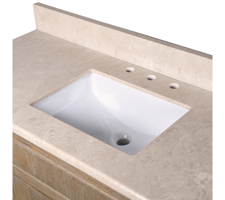 Vrchná doska je vyrobená z mramoru a v jej strede je zabudované umývadlo. Na zadnej strane je vyvýšený okraj, ktorý ochráni stenu a otvory na inštaláciu vodovodných kohútikov. Svetlá béžová farba výborne dopĺňa teplé tóny dreva a prirodzená kresba kameňa pôsobí luxusným dojmom.