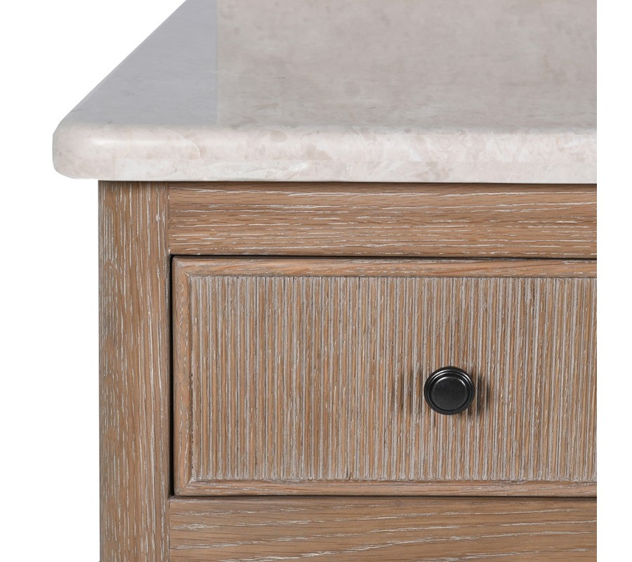 Drevo má naturálnu svetlú hnedú farbu s výraznou kresbou letokruhov. Povrch je upravený efektom vymytej farby, ktorý dodáva nábytku štýlový vintage vzhľad. Svetlý náter usadený v hrubších ryhách tiež zdôrazňuje štruktúru dreva a zdobenia. Predné strany zásuviek, dvierka a bočné strany zdobí vyrezávaný rebrovaný reliéf. Tenké vertikálne línie vytvárajú jemný kontrast k prirodzenému vizuálu dreva. Okrúhle úchytky sú vyrobené z kovu v tmavej farbe a tiež ich zdobí jemný horizontálny reliéf. Nábytku dodávajú nádych vidieckej estetiky.