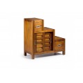 Nábytok má mohutné siluety a dominujú v ňom striktné rovné línie, pravé uhly a hladké povrchy. Úchytky sú vyrobené z bronzu, ktorý korešponduje s odtieňmi dreva a dodáva nábytku luxusný vzhľad. Na niektorých zásuvkách a policiach sú tiež umiestnené úchytky na menovku, pôsobiace šarmantným vintage dojmom.
