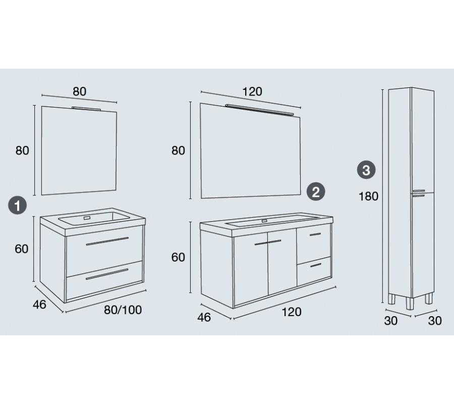 Komplet obsahuje kúpeľnový set (skrinka pod umývadlo + umývadlo + zrkadlo) a ďaľšie časti zostavy v troch rozmeroch. Pre vloženie do košíka či ďalšie informácie kliknite na odkazy pod obrázkami kde sa nachádzajú rozličné skrinky podľa rozmerov. Sú k dipozícií dva farebné odtiene (viď galéria obrazkov). Pre konkrétny výber nás prosím kontaktujte.