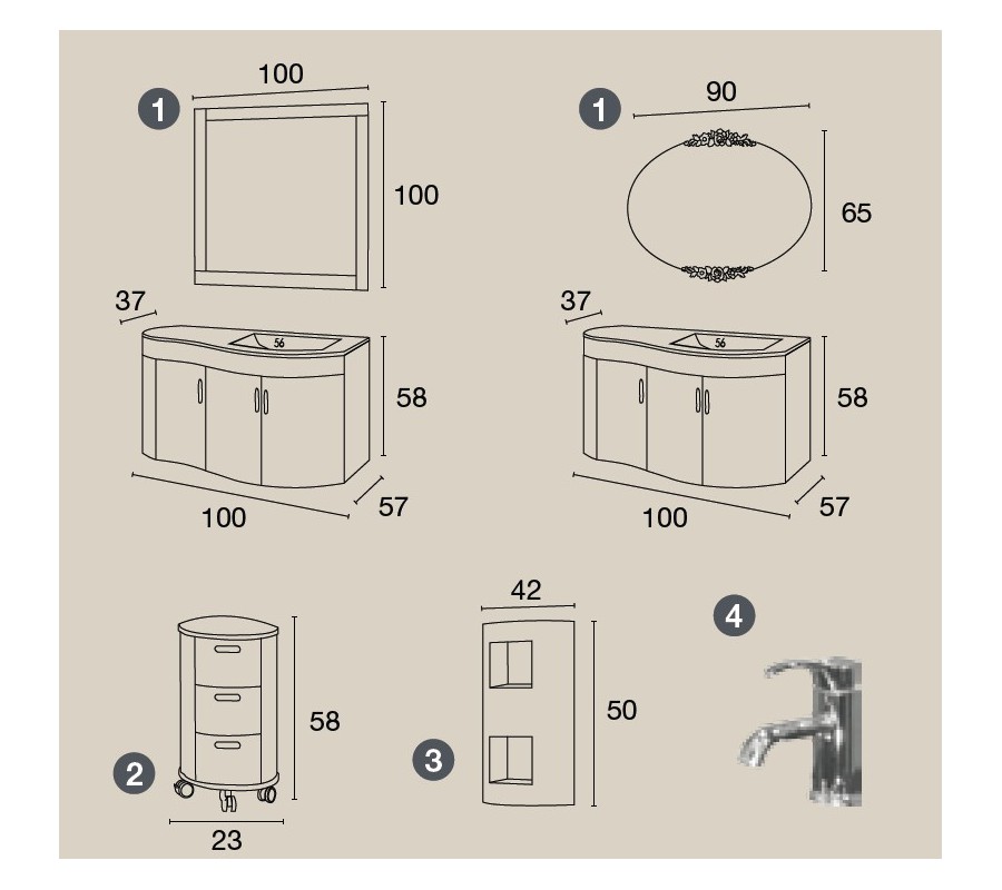 Komplet obsahuje kúpeľnový set (skrinka pod umývadlo + umývadlo + zrkadlo) a ďaľšie časti zostavy, Pre vloženie do košíka či ďalšie informácie kliknite na odkazy pod obrázkami. Nábytok má v detailoch použité krištály SWAROVSKI. Je možný výber zo štyroch farebnýchprevedení (viď galéria obrázkov). Pre bližšiu špecifikáciu nás prosím kontaktujte.