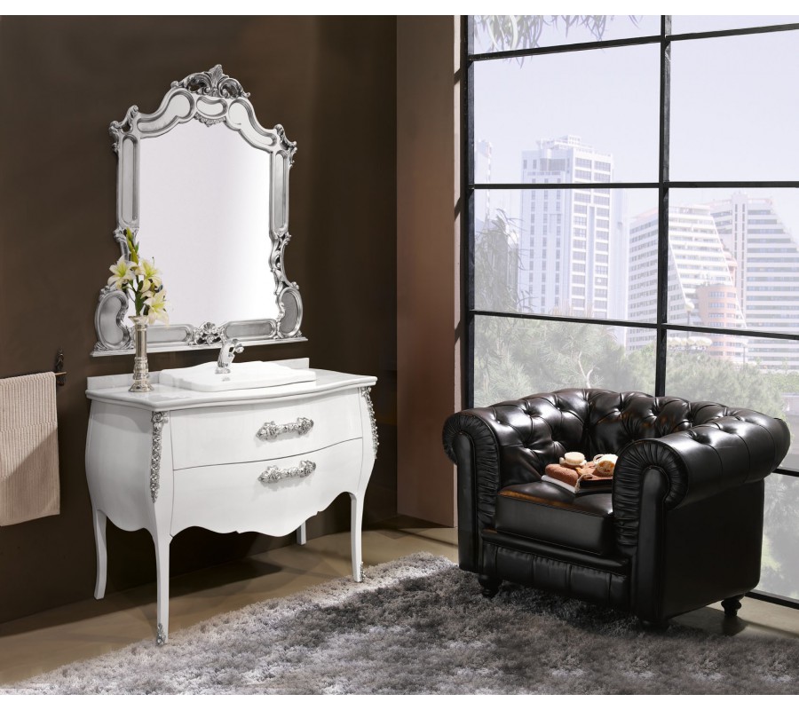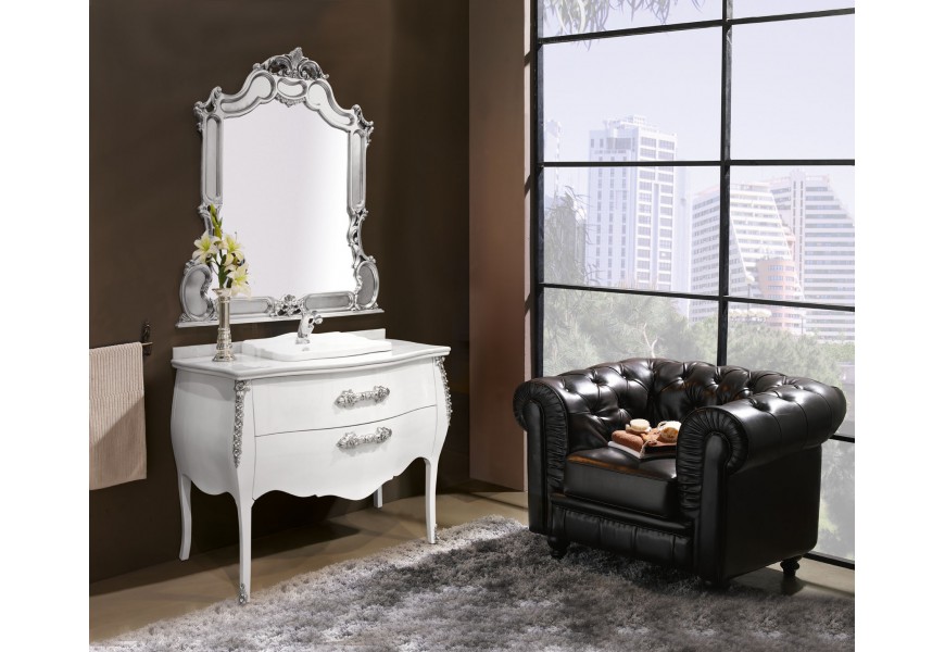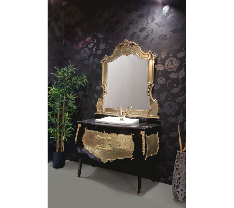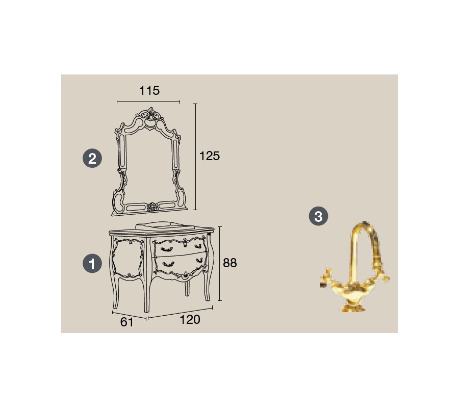 Komplet obsahuje kúpeľnový set (skrinka pod umývadlo + umývadlo + zrkadlo) a ďaľšie časti zostavy, Pre vloženie do košíka či ďalšie informácie kliknite na odkazy pod obrázkami. Zároveň prosíme pri objednávke špecifikovať farbu detailov (zlato alebo striebro). Túto luxusnú kombináciu je možné vyrobiť aj v rôznych farbách. V prípade záujmu nás kontaktujte.