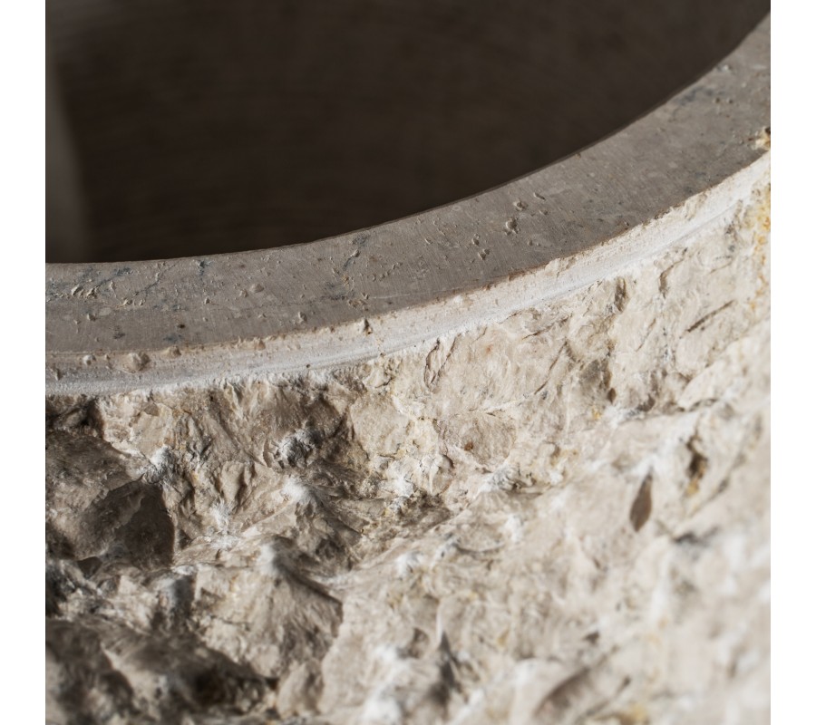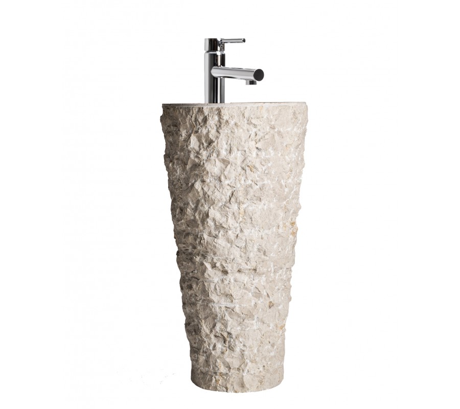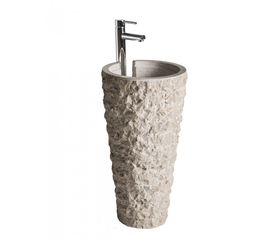Umývadlo je vyrobené z prírodného kameňa v svetlej sivej farbe. Naturálny pôvod materiálu a remeselné ručné opracovanie zaručuje unikátny vzhľad každého kusa. Do miestnosti prinesie výrazný prírodný element a vďaka výške 71 cm bude pôsobiť dominantne.