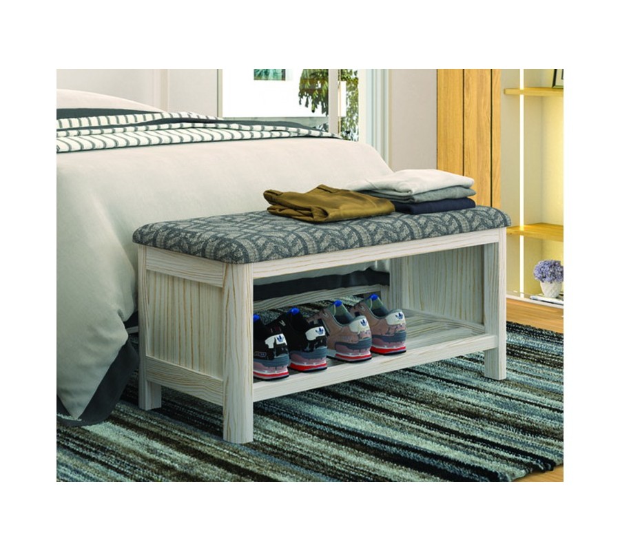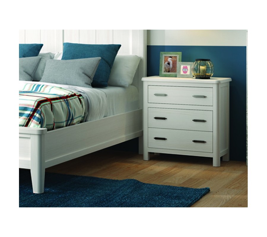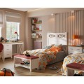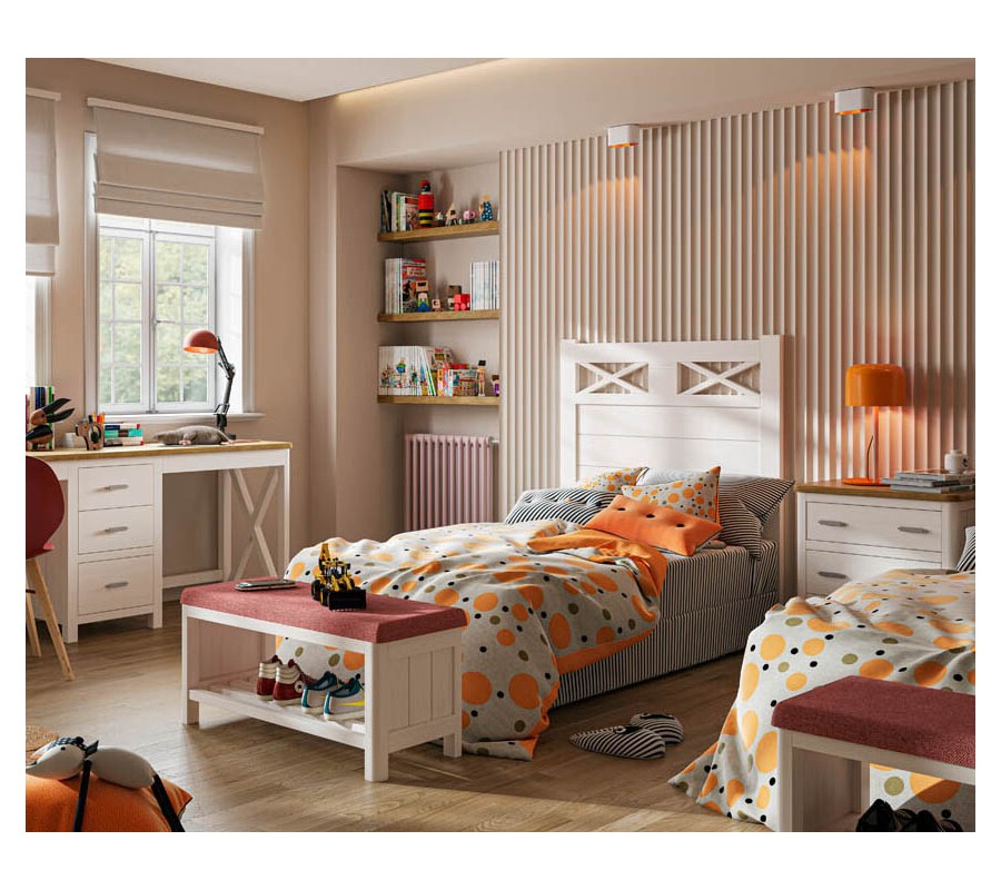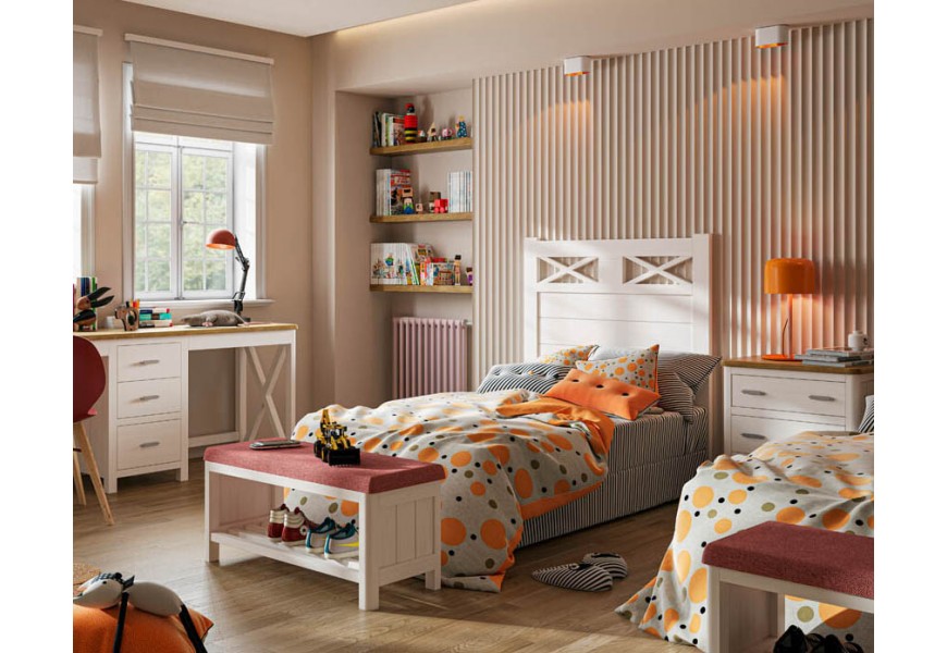 V zostave sa nachádza pohodlná a pevná jednolôžková postel s dreveným čelom s dekoráciou, ktorá posteli dodáva vidiecky nádych. Ďalej sa v zostave nachádza masívny nočný stolík z mohutnými nožičkami, ktoré nesú tri zásuvky s kovovými úchytkami v striebornej farbe. Skvelý doplnok ku posteli, ktorý je nie len estetický ale taktiež veľmi praktický kúsok je drevená lavica. Má jednu poličku na jej spodku čo je vhodné pre uschovanie prezuviek alebo topánok. Doska lavice je čalúnená čo pridáva na jej komfortnosti. Posledný kúsok zo zostavy je dvojitý písací stôl s tromi zásuvkami. Po bokoch stola sa nachádzajú dekorácie, rovnaké ako je čelo postele.