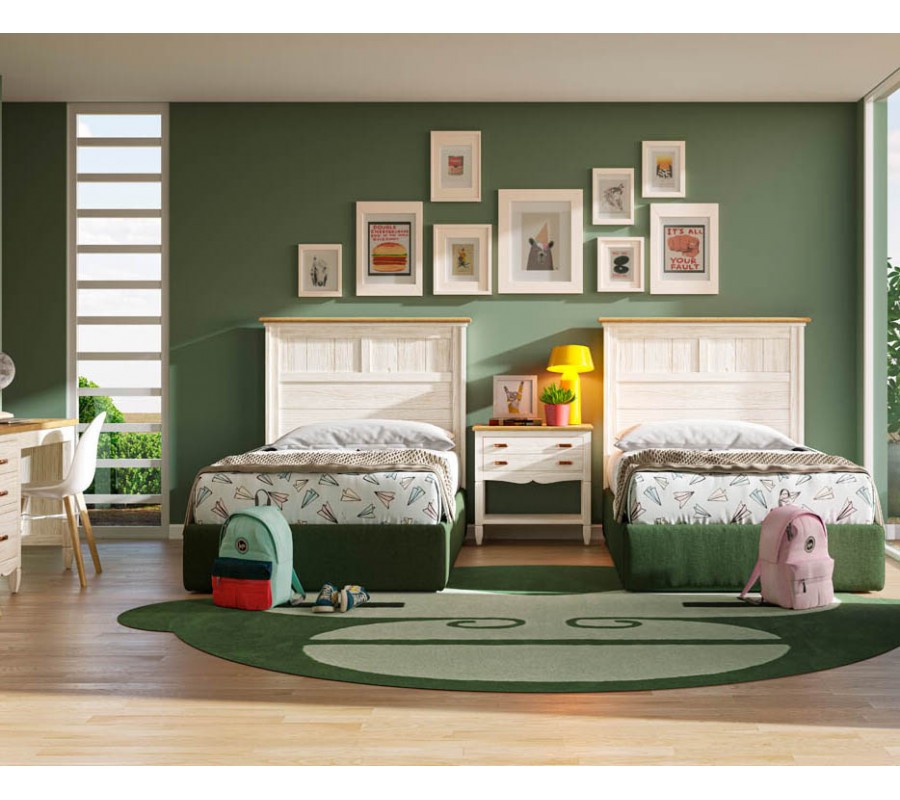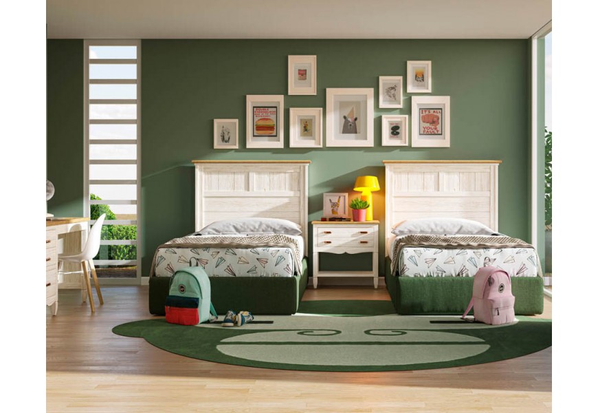 V zostave sa nachádza  jednolôžková posteľ vyrobená z masívneho dreva od dodávateľa s certifikátom obnovy lesného porastu, vďaka čomu je vhodnou udržateľnou a ekologickou voľbou. Elegantná posteľ disponuje pevným rámom a vysokým obdĺžnikovým čelom, ktoré je zdobené jemným elegantným geometrickým vzorom. Ako skvelý doplnok k posteli je práve nadčasový nočný stolík ,ktorý  disponuje dvomi priestrannými zásuvkami s kovovými rukoväťami, ktorých farebné prevedenie máte možnosť si sami zvoliť z troch možností v priloýenom vzorkovníku. A ako posledný zo zostavy je luxusný písací