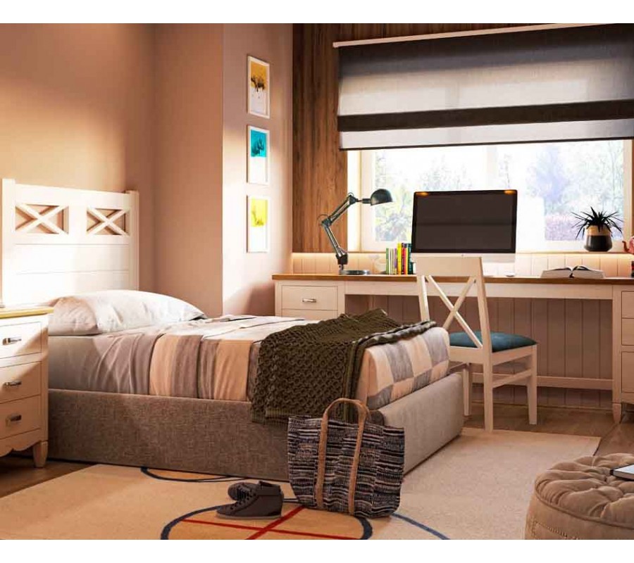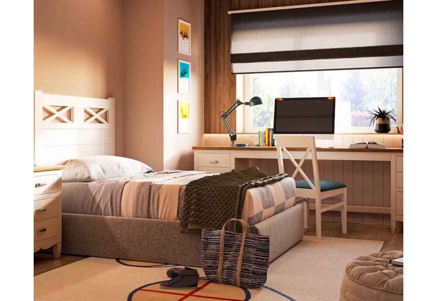 Zostava ponúka luxusnú jednolôžkovú posteľ, ktorá má vysoké čelo s vyrezávaným detailom rovnakým ako na stoličke s príjemným textilným profilom. Ďalší je moderný nočný stolík a písací stôl. Zostava predstavuje nadčasový, masívny nábytok najvyššej kvality.