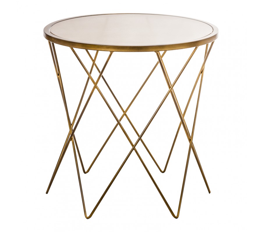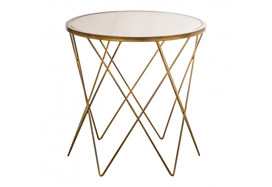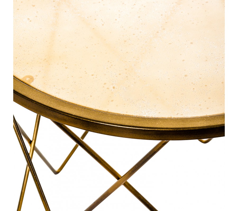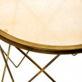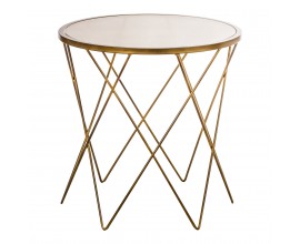 Okrúhly príručný stolík vyrobený z tepaného kovu v zlatej farbe, jednoduchý a elegantný.