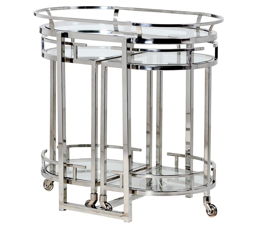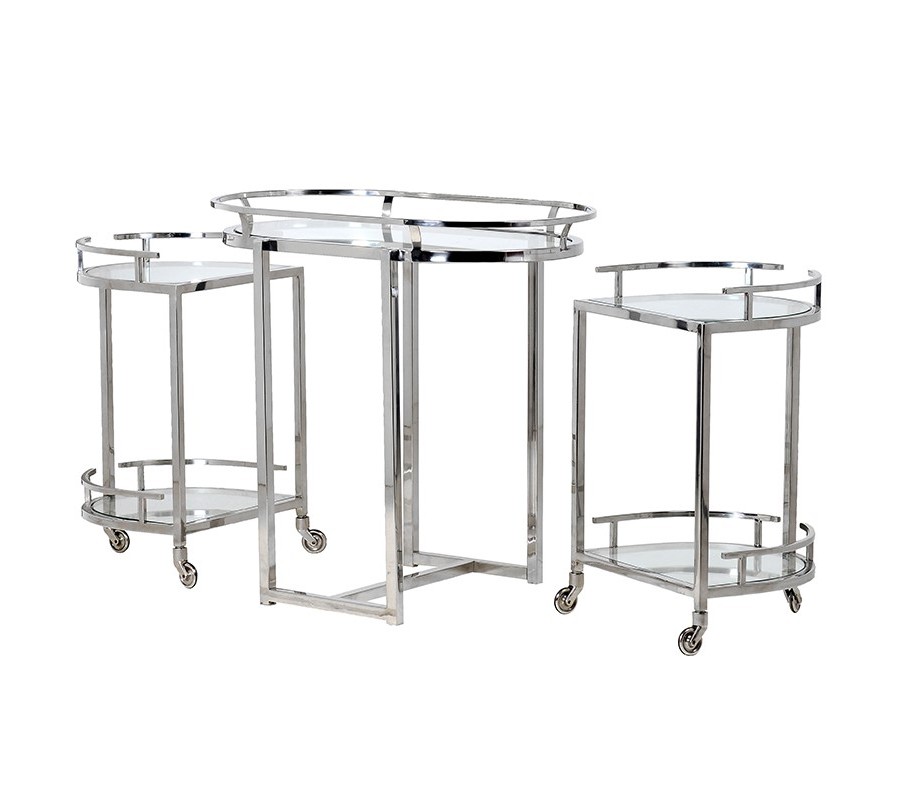 Set luxusných art-deco príručných stolíkov Virginie v chrómovom prevedení zaujmú svojou jednoduchosťou. Sú vyrobené z kovovej konštrukcie, sklenenej dosky, ktorá má oválny tvar. Poslúžia ako odkladacie, príručné stolíky. Sú vhodné na odloženie a servírovanie alkoholických nápojov vďaka praktickej odkladacej poličke v spodnej časti stolíkov s vozíkmi. Manipuláciu uľahčujú namontované kolieska. Hodia sa do pánskych klubov, či luxusne zariadených barov a reprezentatívnych priestorov firiem. V čase nevyužitia dokonalo zapadnú do seba a nezaberajú veľa miesta. Rozmery väčšieho stolíka sú: výška 79,5 cm, šírka 84 cm, hĺbka 52 cm. A rozmery štyroch menších stolíkov sú: výška 68 cm, šírka 38 cm, hĺbka 45 cm. Menšie stolíky majú posuvné koliečka, čo umožňuje ich premiestňovanie. Celkovo pôsobia dizajnovo a futuristicky.