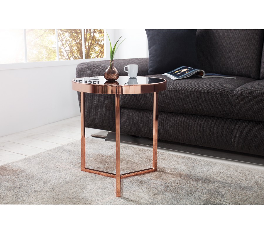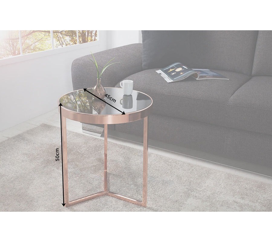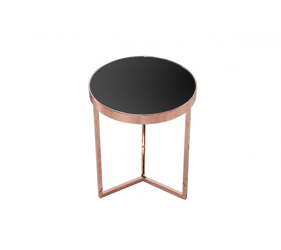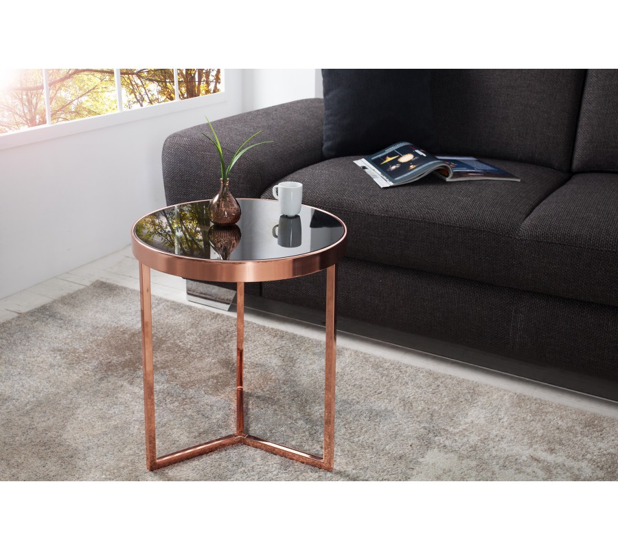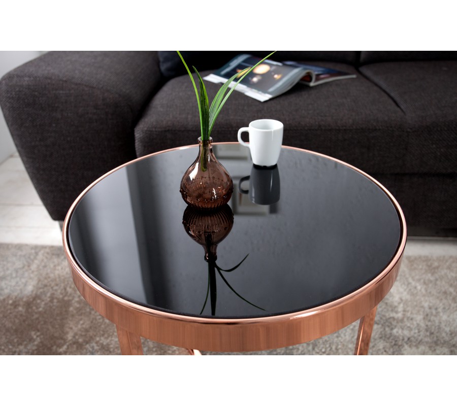 Príručný stolík Lava vyniká elegantným okrúhlym tvarom, ktorý je doplnený o výraznú medenú kovovú konštrukciu s lesklým povrchom. Vrchnú časť tvorí nepriehľadná čierna sklenená doska z tvrdeného skla, ktorá je zároveň pevná a vizuálne atraktívna. Vďaka kombinácii lesklého kovu a tmavého skla pôsobí celý dizajn luxusne a moderne.