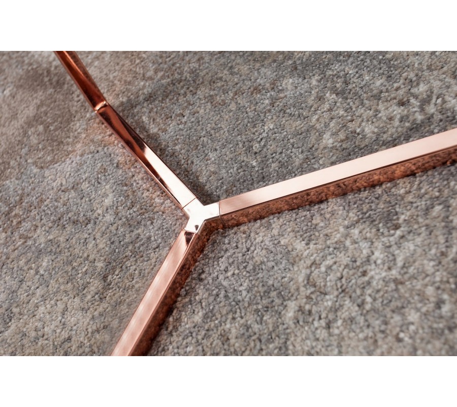 Stolík stojí na troch nohách, ktoré sa smerom nahor napájajú na rám vrchnej dosky, čím vytvárajú stabilnú a zároveň ľahko pôsobiacu konštrukciu. Tento vizuálne zaujímavý detail dodáva stolíku štruktúrovaný vzhľad, typický pre art deco a glamour štýl.