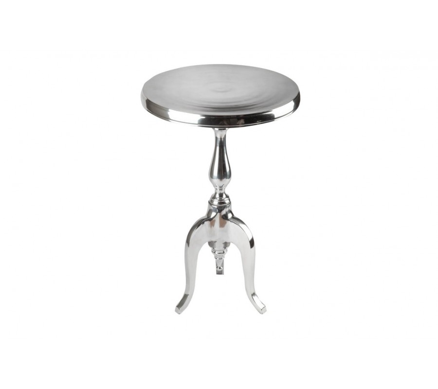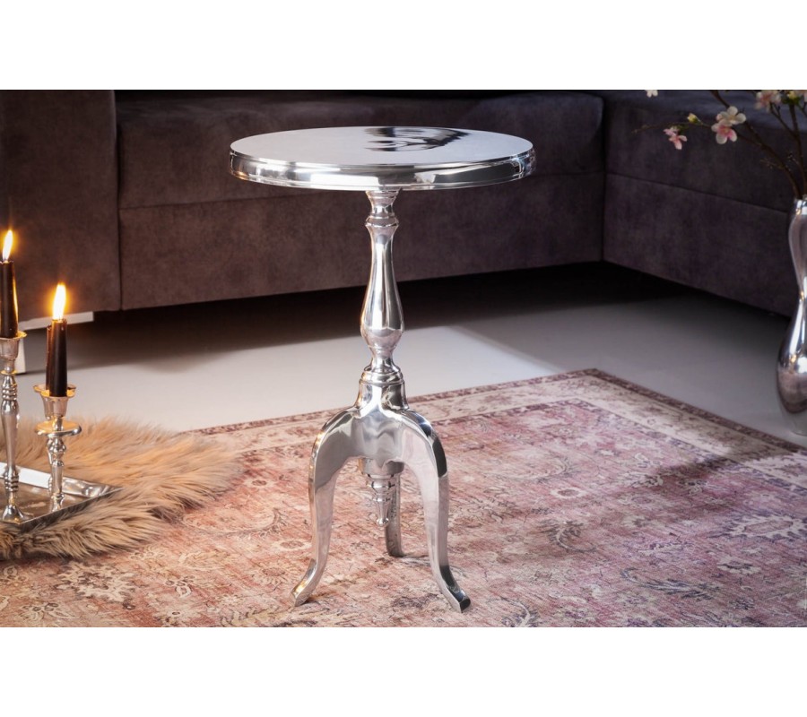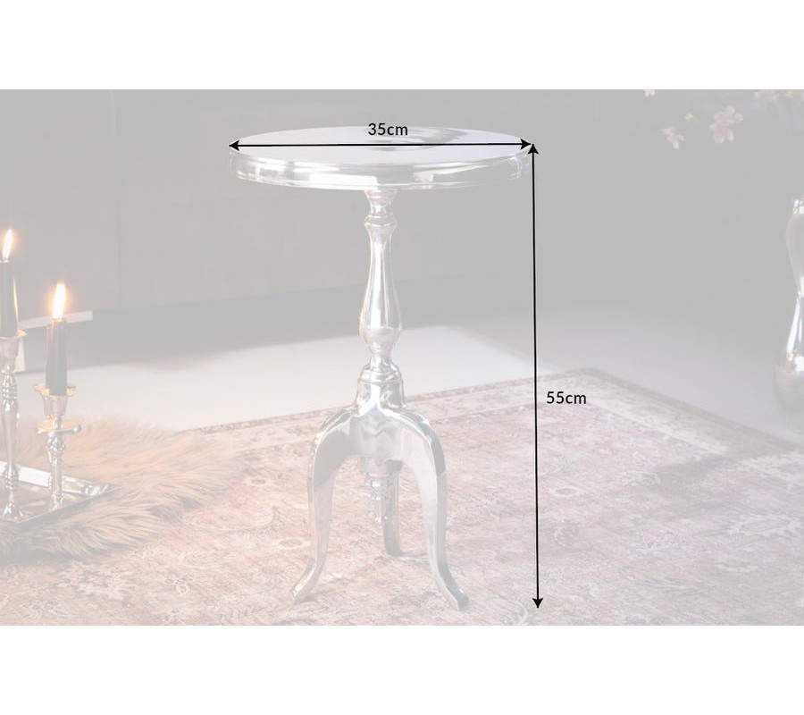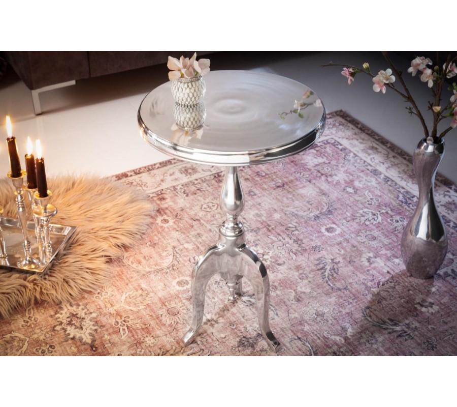 Štýlový barokový glamour okrúhly strieborný príručný stolík Modern Barock z chrómu s tromi kabriolovými nožičkami 55 cm