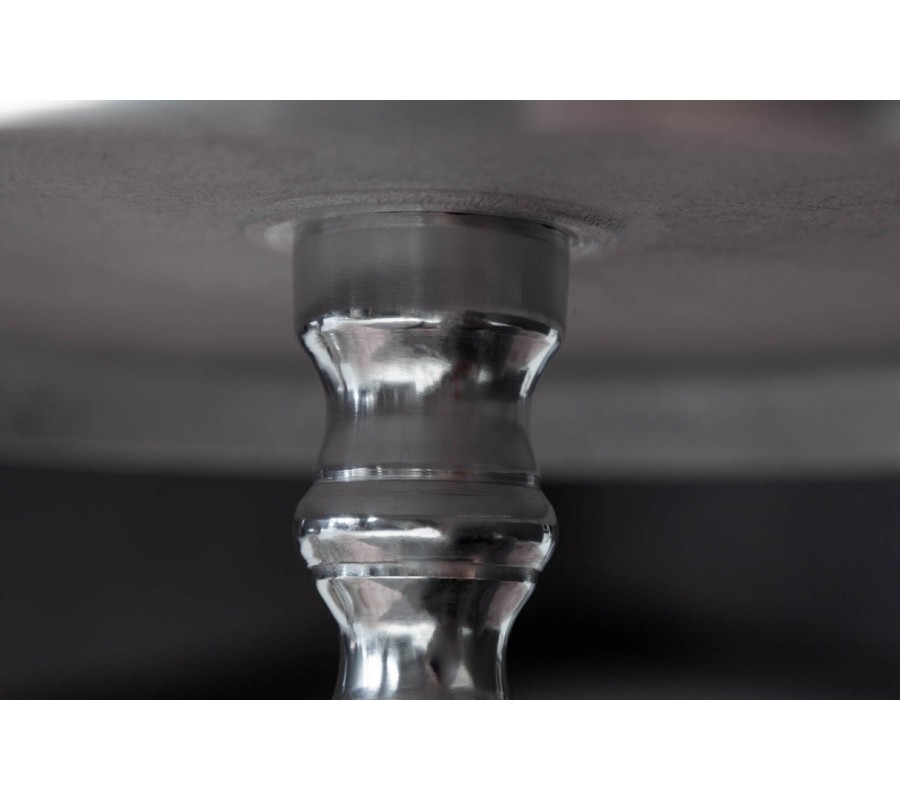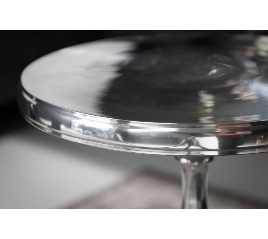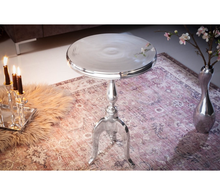 Príručný stolík Modern Barock zaujme už na prvý pohľad svojím elegantným tvarom a vysoko lesklým chrómovým povrchom. Je vyrobený celý z kovu, jeho okrúhla doska sa opiera o výrazne tvarovanú stredovú nohu, ktorá sa delí do troch elegantných kabriolových nožičiek – typických pre barokový štýl.
