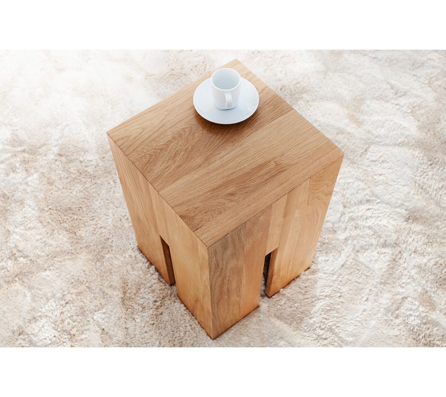 Štvorcový tvar a výrezy v spodnej časti nožičiek vytvárajú zaujímavú hru geometrie a vzdušnosti, ktorá dodáva stolíku moderný umelecký ráz. Povrch je hladko opracovaný a pôsobí robustne aj vizuálne čisto.