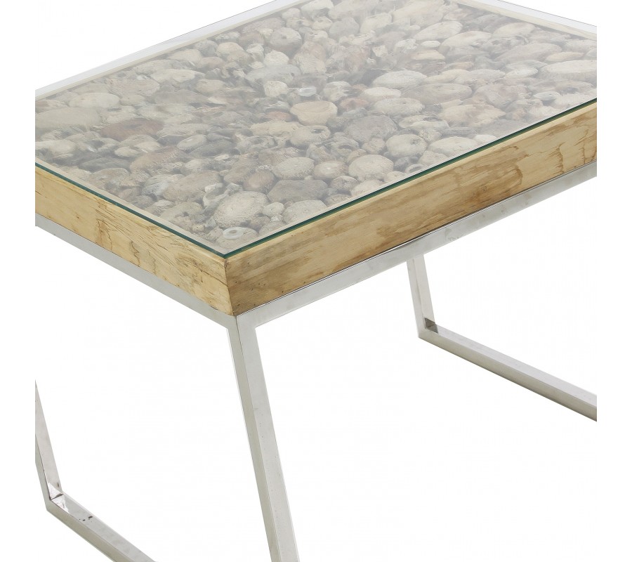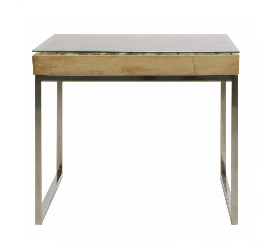 Štýlový príručný stôl ARGAO má oceľovú základňu a drevenú hornú dosku plnenú tropickým drevom. Drevená doska je pokrytá sklenenou platňou.