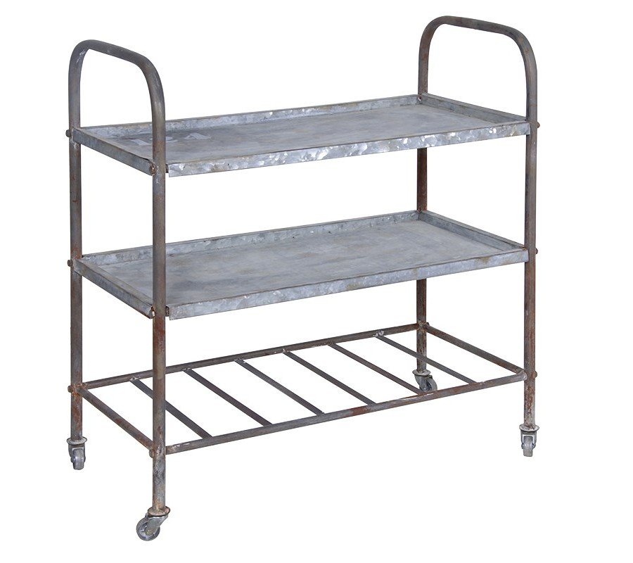 Industriálny vintage servírovací vozík Karl na kolieskach z kovu v sivej farbe s efektom zámerného zostarnutia 88 cm