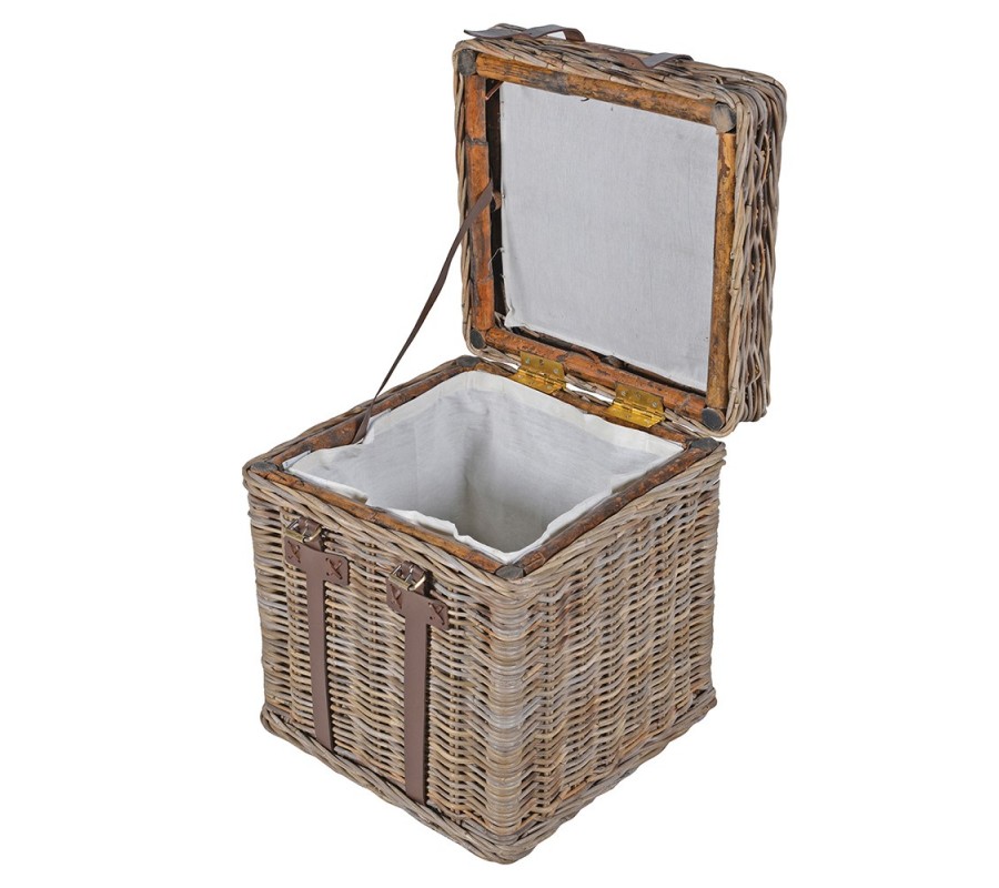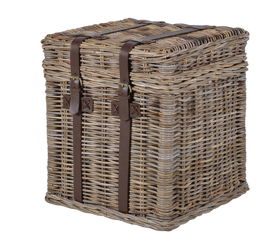 Truhlica je pokrytá hustým ratanovým výpletom v elegantných jemných odtieňoch sivej a hnedej. Naturálne vlákna v kombinácii do subtílnym farebným odtieňom dodávajú nábytku prírodný vzhľad. Dizajn skvele dopĺňajú dva kožené pásy v tmavej hnedej farbe, ktoré paralelne vedú okolo nábytku a sú ukončené prackou na bezpečné uzavretie úložného priestoru. Vnútro truhlice je prekryté bielym textilným poťahom. Uzatvára sa vekom s kovovými pántami.