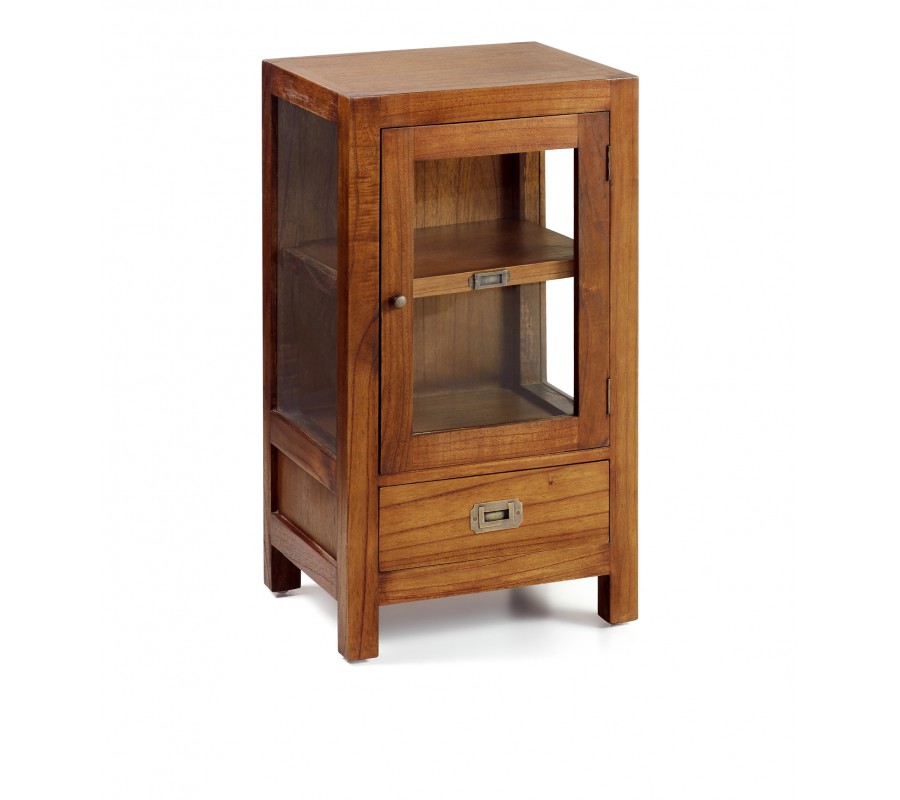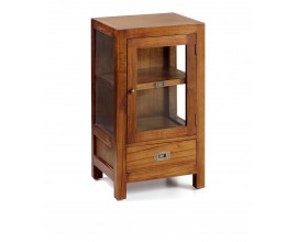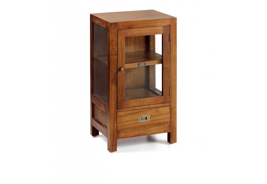Dizajnový príručný stolík Star z masívu hnedej farby so sklenenými dvierkami a zásuvkou 80cm
