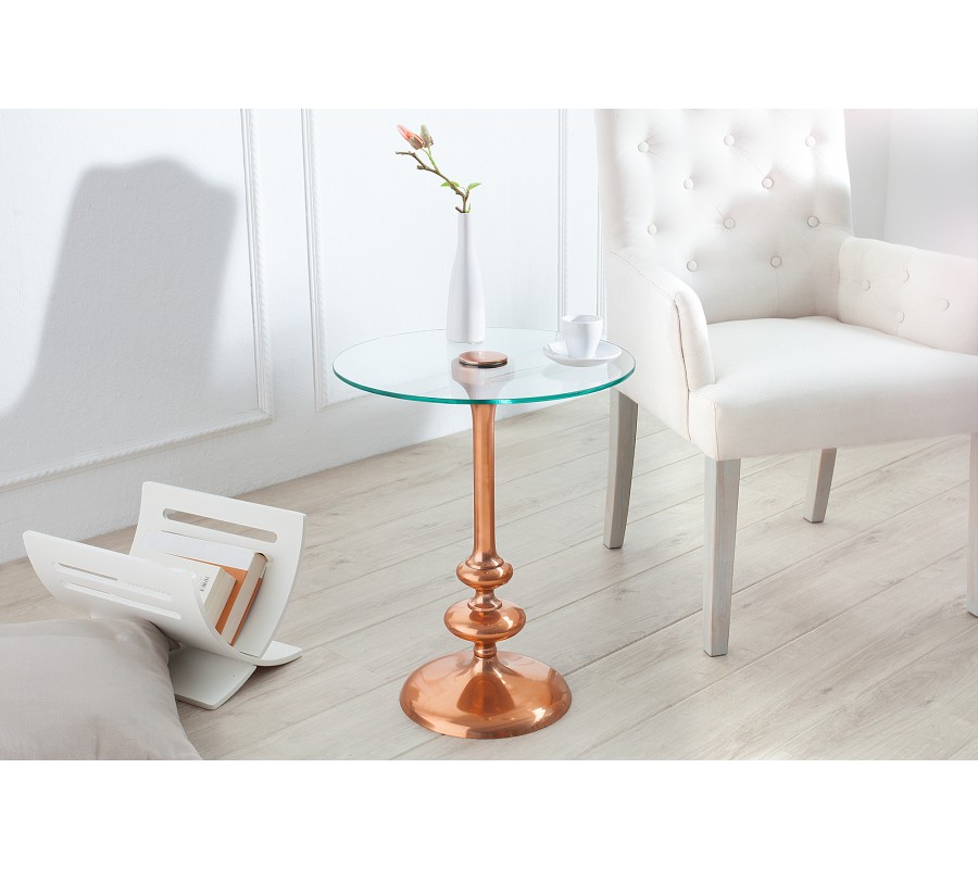 Luxusný odkladací stolík v medenom prevedení bude ideálnym doplnkom moderne zariadených domácností, ktorým vďaka svojmu vzhľadu dodá nádych luxusu. Masívny podstavec vo veľmi elegantných, zaoblených tvaroch je vyrobený z kovovo-hliníkovej zliatiny. Na ňom sa nachádza okrúhla povrchová doska z bezpečnostného, tvrdeného skla. Jednoduchý a čistý no pritom elegantý a honosný. Taký je tento jedinečný odkladací stolík, ktorý v sebe dokonale spája prvky moderného a klasického, prepychového nábytku. Svoje miesto si nájde či už v obývačke, alebo spálni či pracovni.
