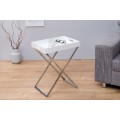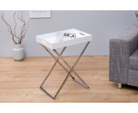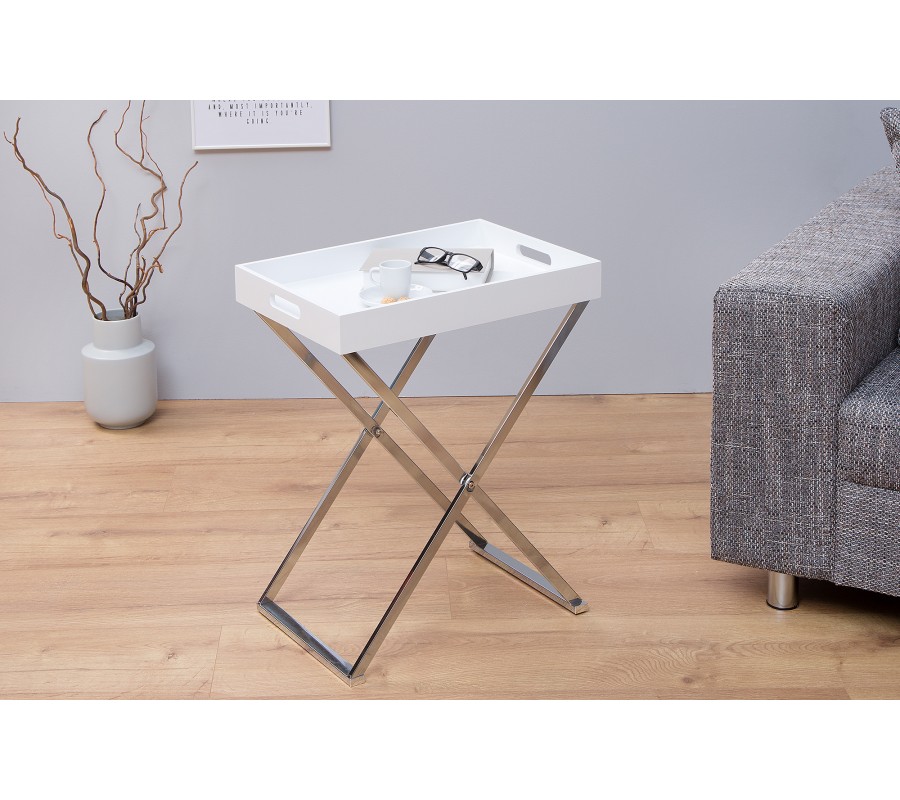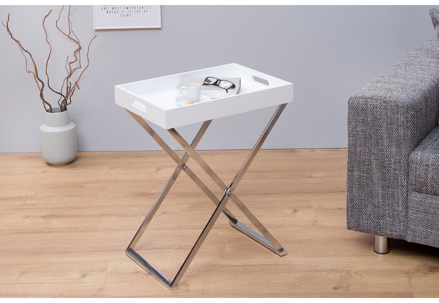Dizajnový odkladací stolík Valet v bielo-striebornom farebnom prevedení zaujme svojim jednoduchým, no premysleným spracovaním. Povrchovú odkladaciu dosku vyrobenú z MDF materiálu možno odobrať zo strieborného, kovového podstavca a samostatne použiť ako praktický, servírovací podnos.