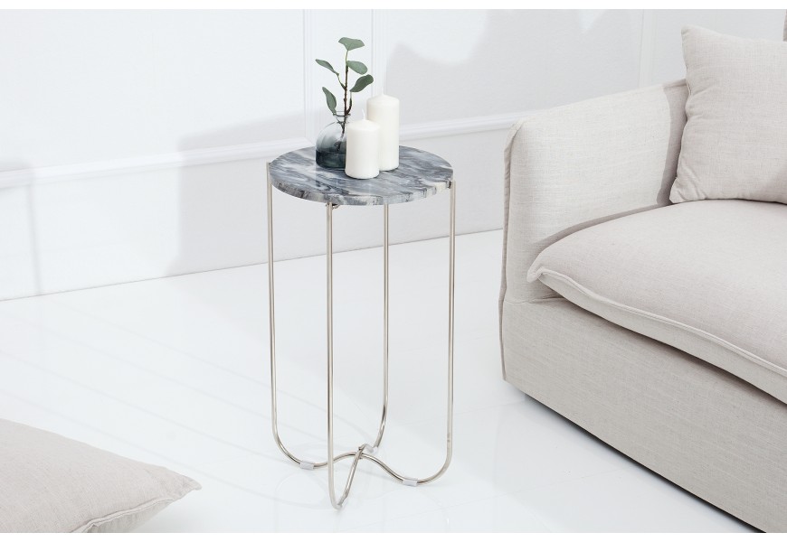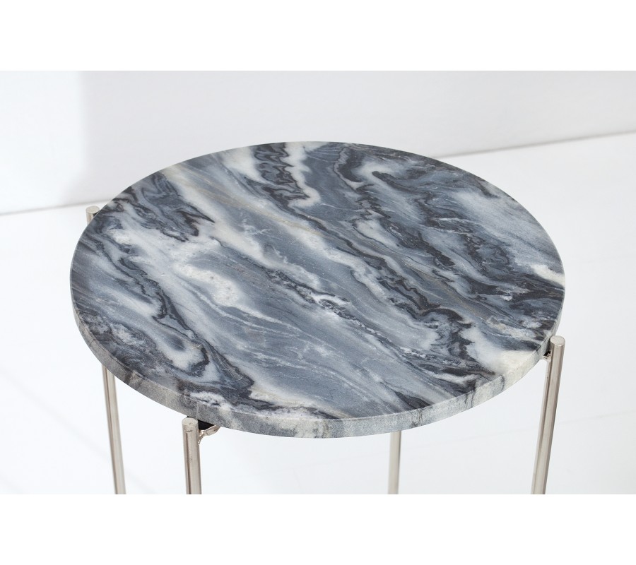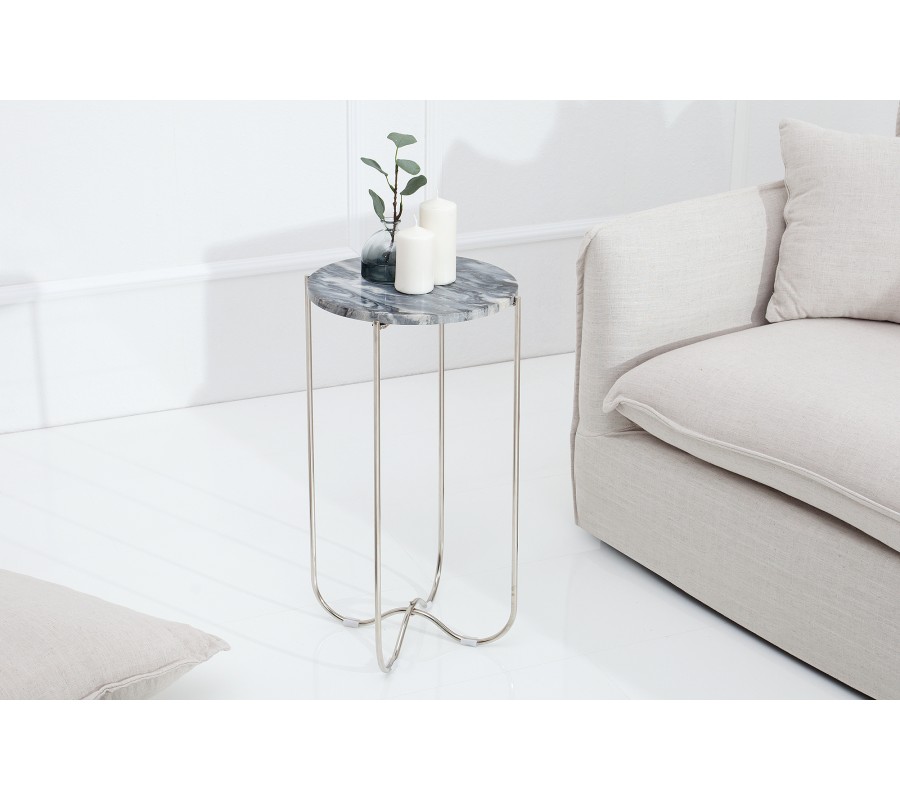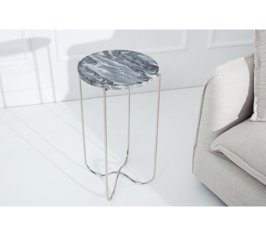 Dizajnový mramorový odkladací stolík z kolekcie Jaspe je krásnym a jedinečným doplnkom interiéru, ktorý ocení každý fanúšik luxusných materiálov a čistého dizajnu. Vo vašej obývačke či spálni ho zaručene nikto neprehliadne. Jednoduché a štíhle kovové nohy v striebornom farebnom prevedení nesú nádhernú, 15mm hrubú povrchovú dosku, ktorá je ručne spracovaná z ušľachtilého mramoru. Povrch každého kúsku sa tak môže mierne odlišovať. Stolík bude ideálnou voľbou najmä do moderne zariadených priestorov ladených v jemných farebných tónoch, ktorým zároveň dodá nádych luxusu.