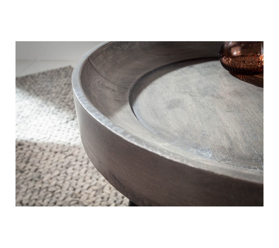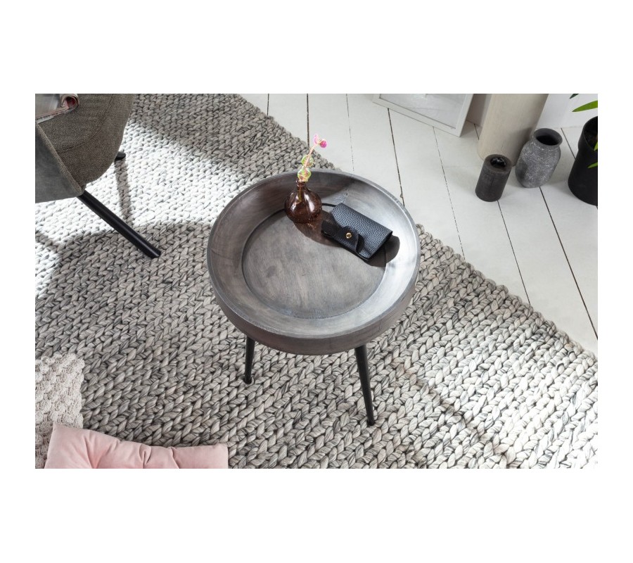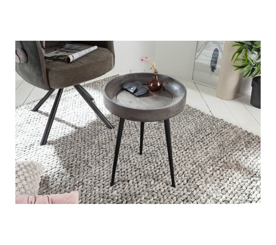 Dizajnový príručný stolík Tamworth IV je vkusným a elegantným doplnkom do vašich obývačiek. Je vyrobený z masívneho akáciového dreva s povrchovým lakom v nadčasovej sivej farbe, ktorá skvelo zapadne do moderných alebo industriálne ladených priestorov. Moderný kruhový tvar povrchovej dosky s vyvýšenými okrajmi je praktickým úložiskom na drobnejšie predmety či dekorácie. Stolík Tamworth IV je doplnený o tri čierne kovové nohy, ktoré zabezpečia skvelú stabilitu a zároveň dopĺňajú celkový moderný vzhľad. Skvelo vynikne v svetlejších priestoroch v kombinácii s masívnym nábytkom a svetlými čalúnenými kreslami či sedačkou.