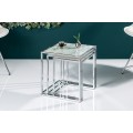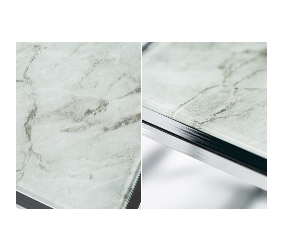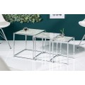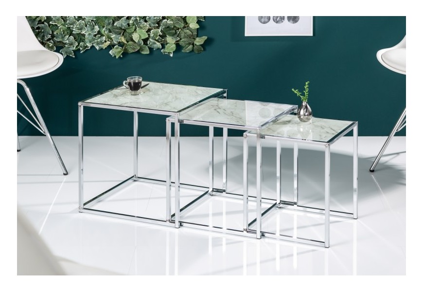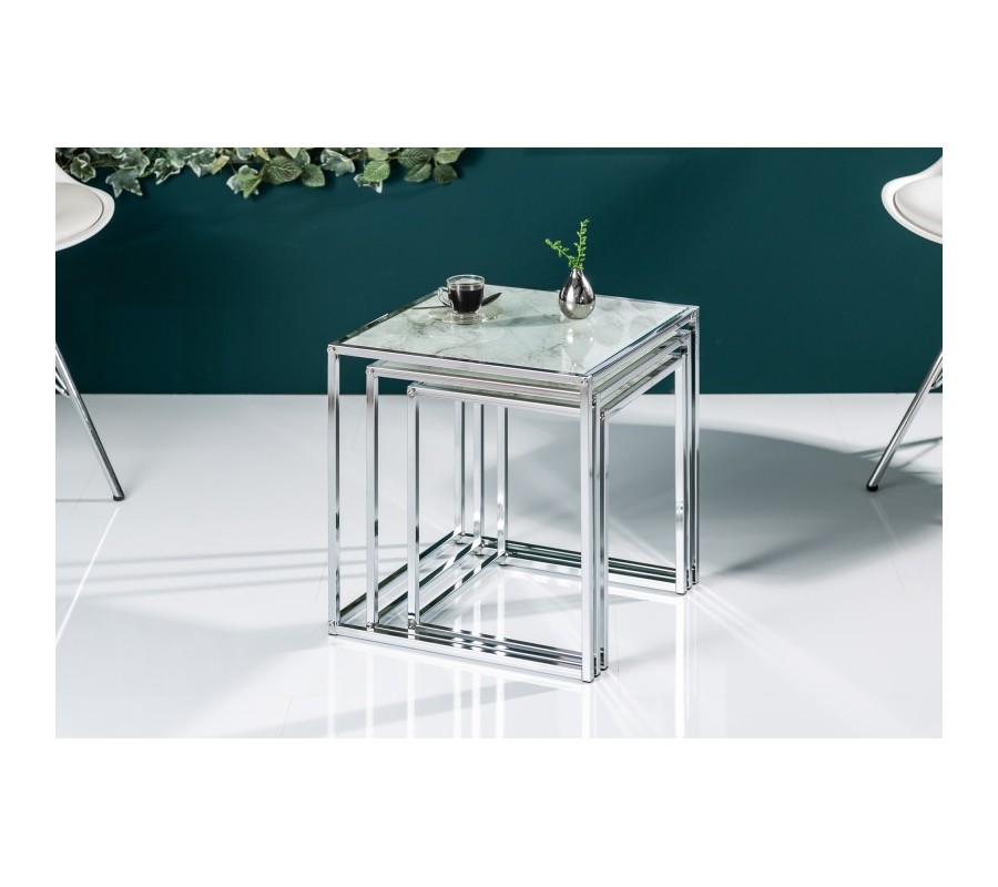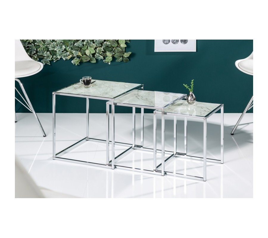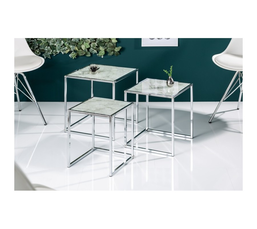 Štýlový set príručných stolíkov Elements svojím elegantným dizajnom zaujme už na prvý pohľad. Ide o tri praktické štvorcové stolíky rôznej výšky, ktoré možno podľa potreby uložiť buď vedľa seba alebo pod seba. Stolíky Elements sa vyznačujú dizajnovou chrómovou konštrukciou, ktorá je doladená o mramorový efekt na povrchových doskách. Vďaka svojmu čistému, inovatívnemu dizajnu a svetlej farebnosti tento set vynikne najmä v moderných interiéroch v kombinácii s chrómovým či iným kovovým nábytkom a výraznými dekoráciami.