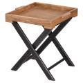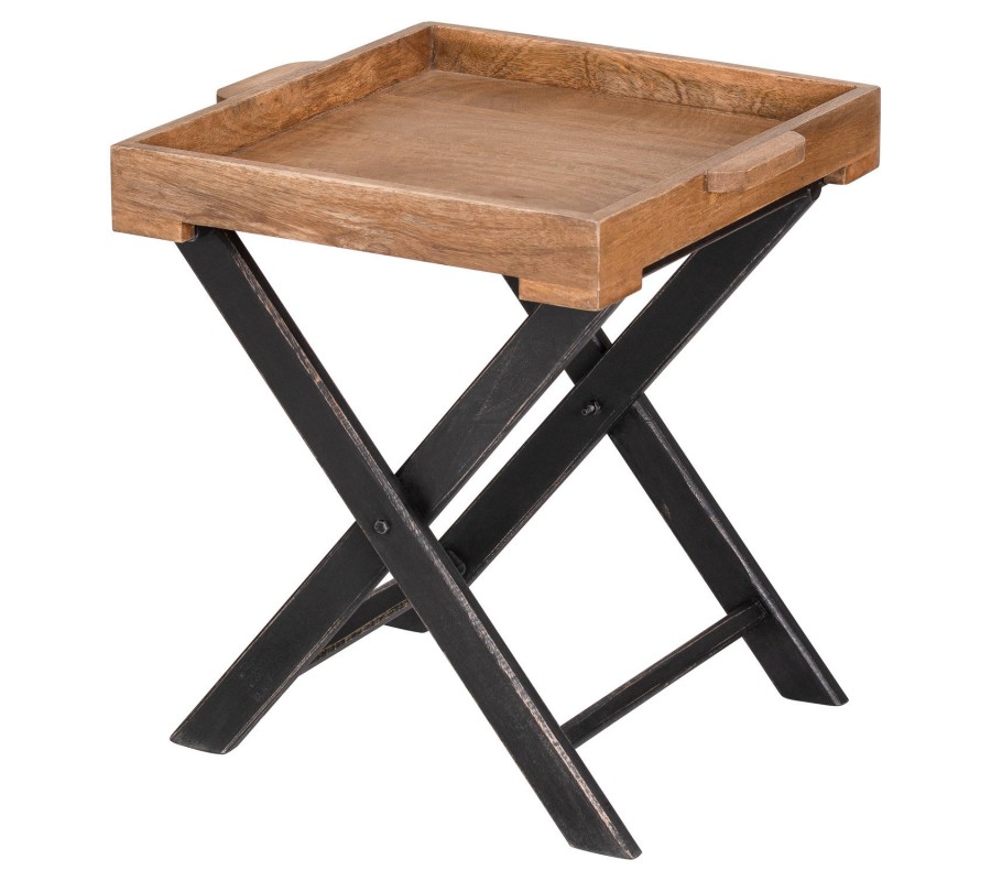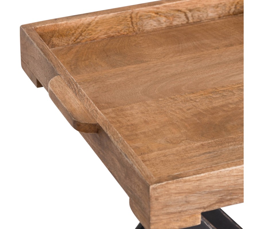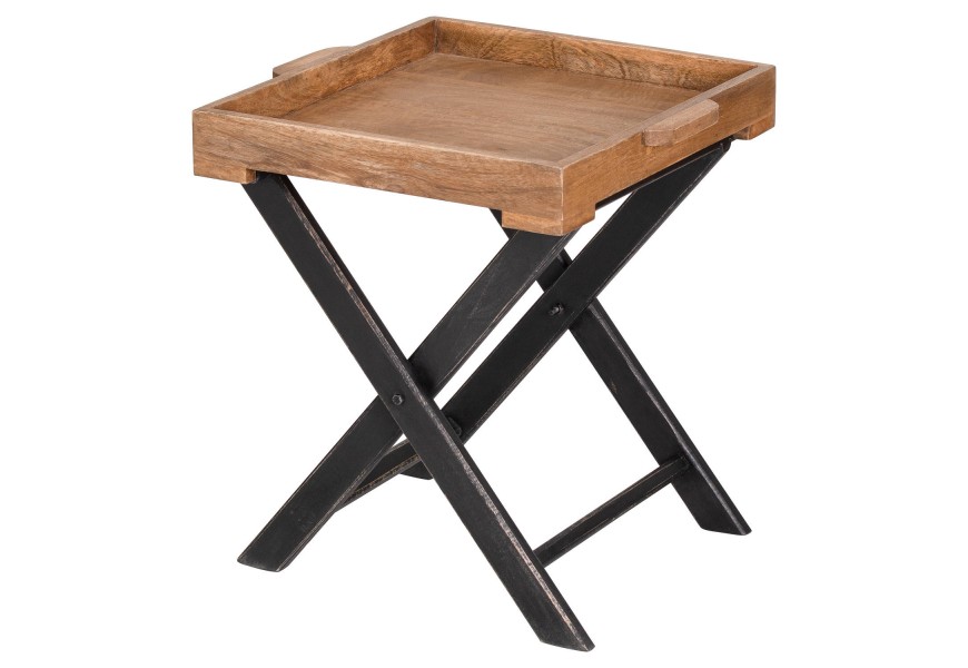 Jedinečný a vkusný príručný stolík z kolekcie nábytku Nyakim v industriálnom štýle pôsobí veľmi jemným a nadčasovým dojmom vďaka minimalistickému prevedeniu. Kombinácia hnedej prirodzenej farby mangového dreva a čierneho náteru na prekrížených nohách stola zaručuje, že stolík Nyakim dokážete veľmi jednoducho zaradiť do chodu Vašej domácnosti, pre zjednodušenie používania je prínosná taktiež možnosť zloženia a rukoväte. Povrchová doska z masívu so zvýšenými hranami sa pýši jedinečnou naturálnou kresbou dreva.