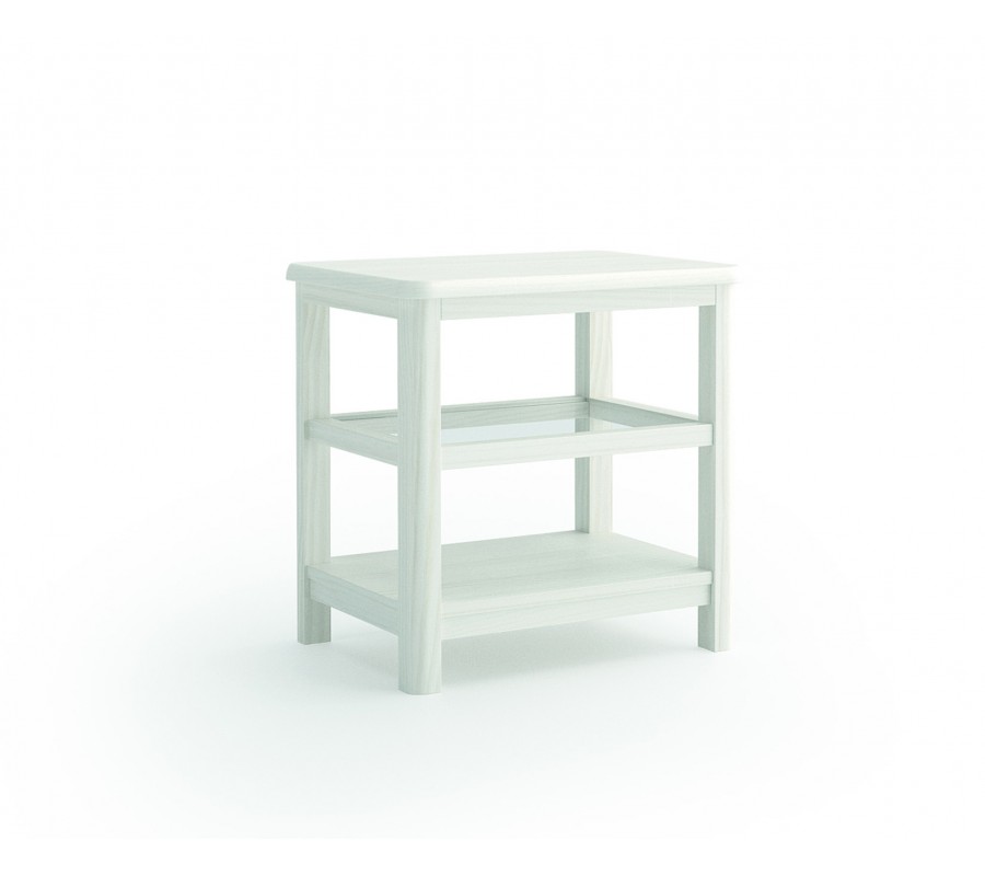 Príručný stolík má obdĺžnikovú vrchnú dosku, položenú na štyroch dlhých nohách. Rohy dosky sú zaoblené a tento tvar sa opakuje aj na predných hranách nôh, čo prináša do moderného lineárneho dizajnu eleganciu. Asi v polovici výšky je umiestnená polica so sklenenou výplňou a v spodnej časti sa nachádza plná drevená polica. Otvorený koncept a sklenený prvok pôsobia ľahkým a vzdušným dojmom.