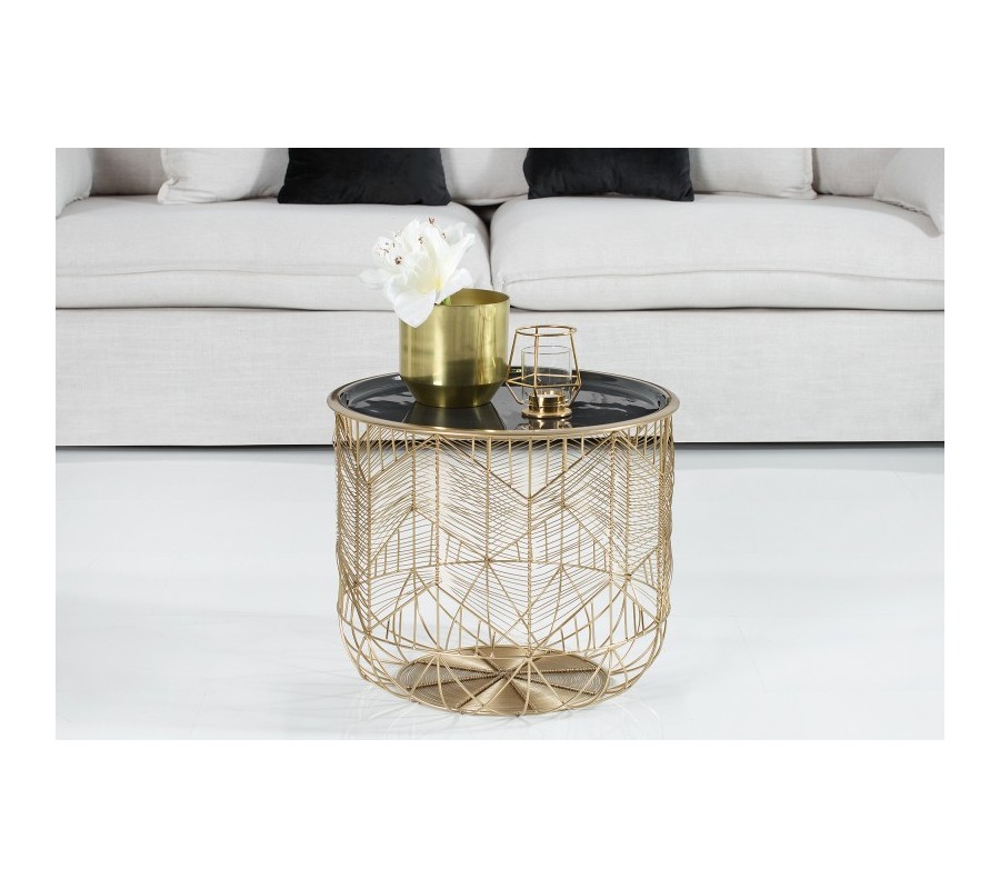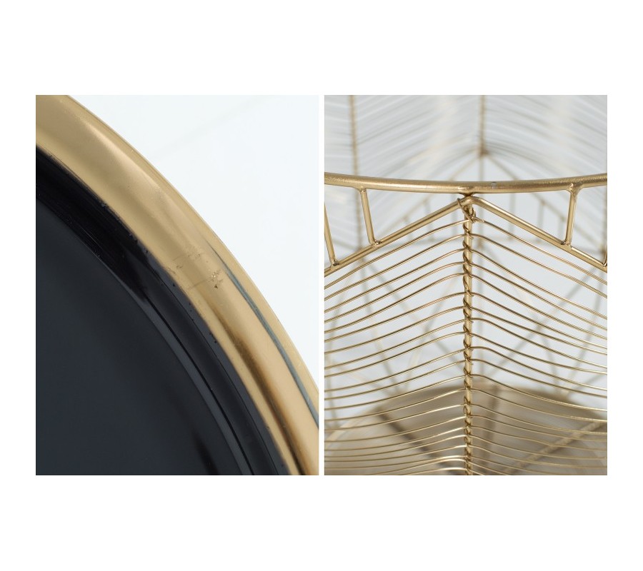 Dizajnový príručný stolík v Art Deco štýle je štýlovým doplnkom do moderných interiérov. Zaujímavé prevedenie robí z tohto stolíku jedinečný kúsok. Vrchná doska je odnímateľná a dá sa použiť ako úložná plocha aj mimo stolíku, zatiaľ čo vnútro stolíku viete využiť ako odkladací priestor na napríklad knihy, časopisy a iné. Zlatá farba je vo veľmi príjemnom kontraste s čiernou farbou vrchnej dosky.