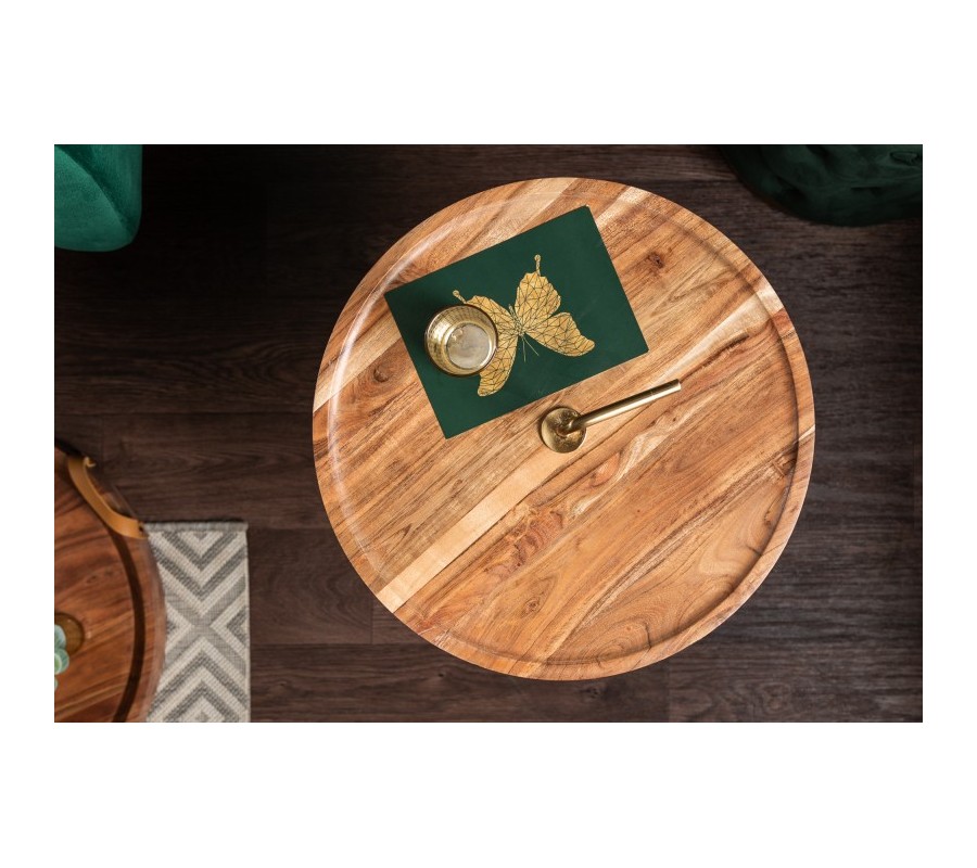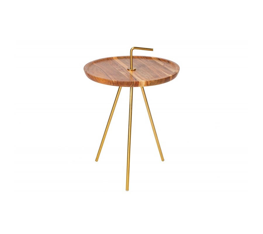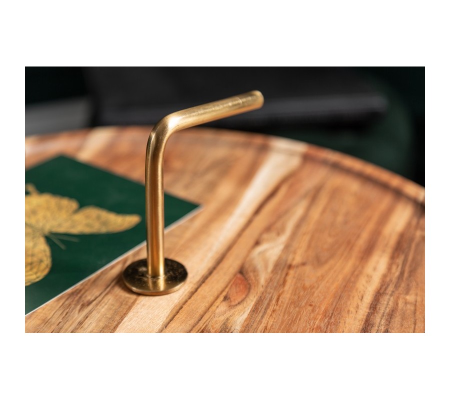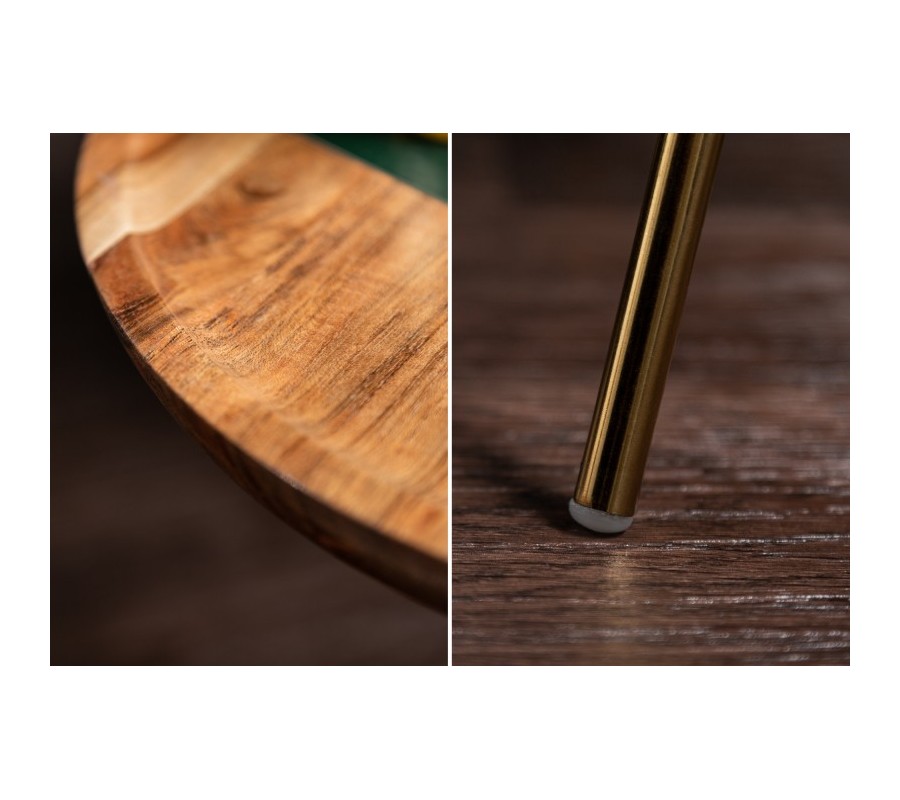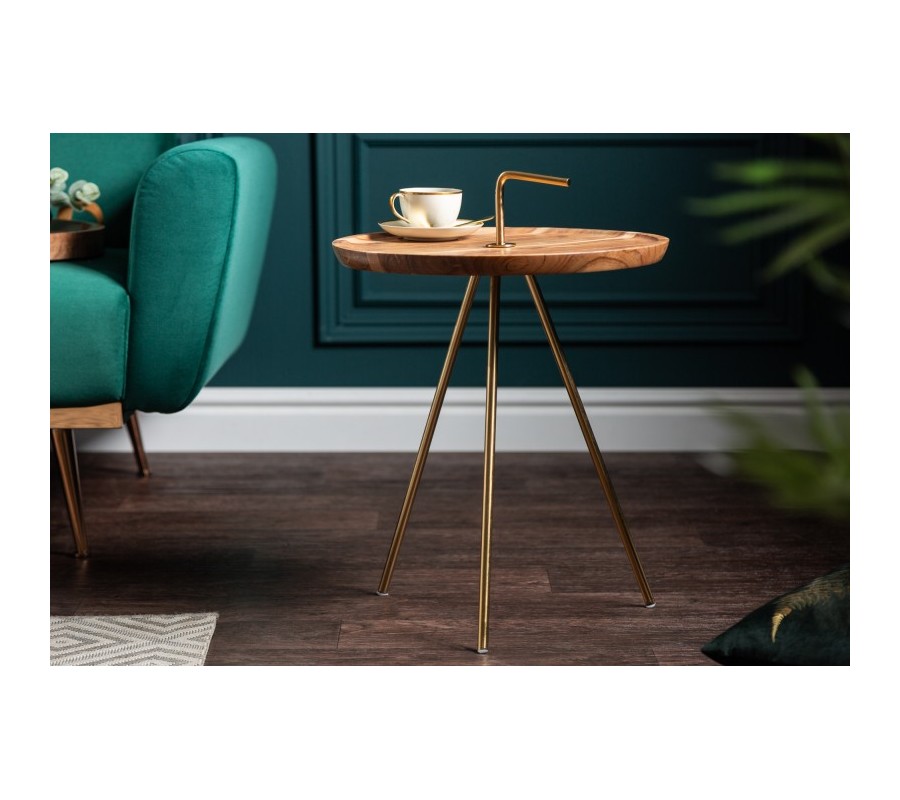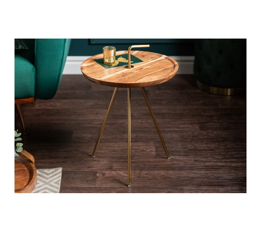 Dizajnový príručný stolík Gedling je vyrobený z masívneho agátového dreva v svetlohnedej farbe. Prírodný materiál je doplnený o kovové nohy, ktoré sa nesú v luxusnej zlatej farbe navodzujúcej art-deco nádych. Kruhový tvar stolíka je praktický a zároveň štýlový a skvelo poslúži ako podstava na rôzne dekorácie, rastlinstvo či ako odkladací priestor. Stolík má tri tenké ľahké nohy z kovu a praktický zlatý úchyt, vďaka čomu je možné stolík jednoducho prenášať. Hnedo-zlatá farebná kombinácia skvelo zapadne do svetlejšie ladených obývačiek, a vaše priestory zaručene zútulní. Odporúčame kombinovať taktiež s ďalšími kúskami z našej kolekcie Gedling.
