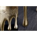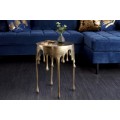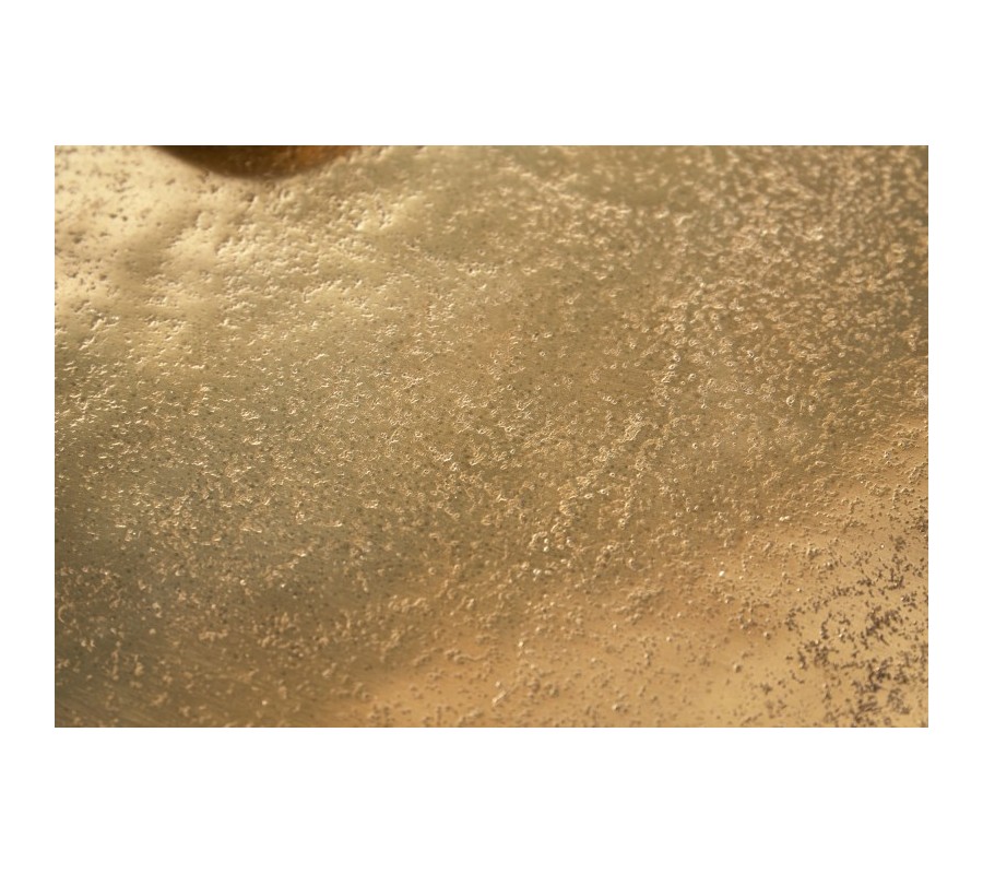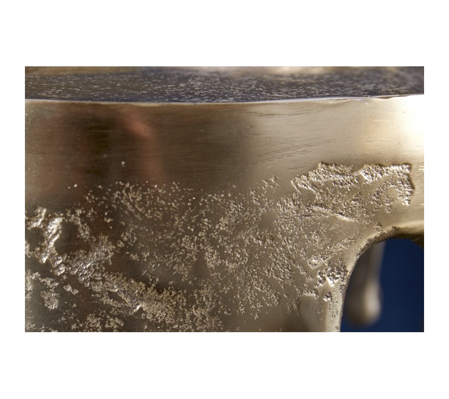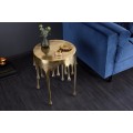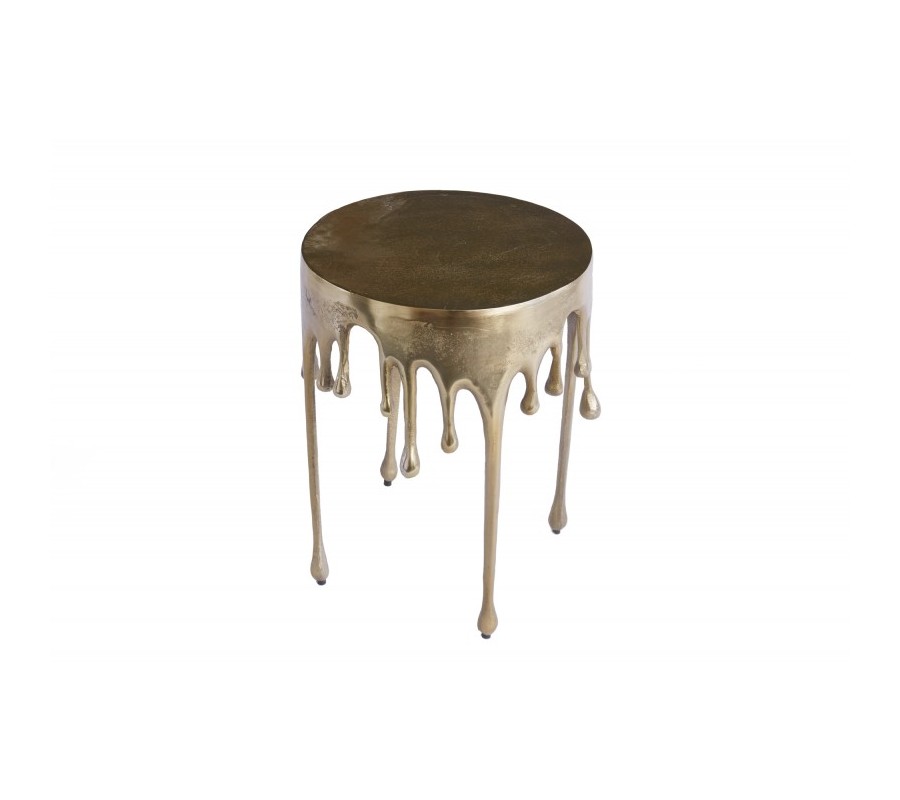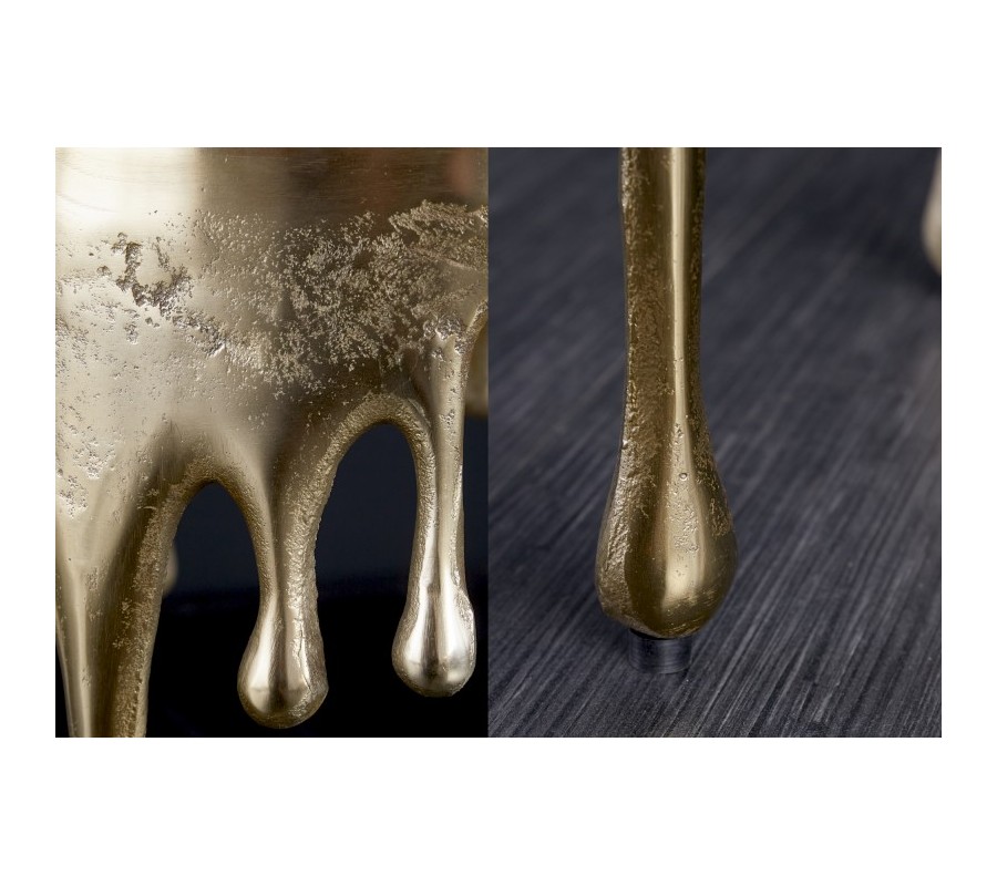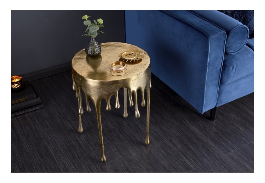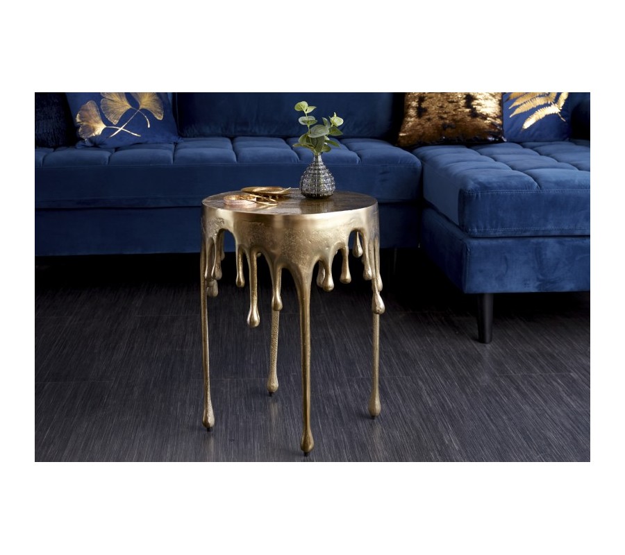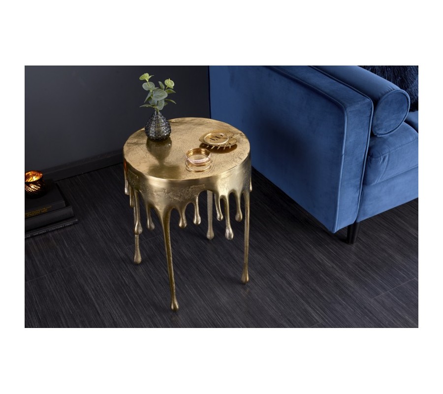 Príručný kruhový stolík Bellair je skutočne jedinečným a originálnym kúskom, ktorý zaujme už na prvý pohľad. Atypický dizajn pripomínajúci stekajúcu hmotu vytvára organický dojem a stolíku vyrobenému z kovu dodáva tekutý efekt. Na povrchu sa objavuje jemná štruktúra, ktorá vytvára vintage či historický nádych. Zlatá farba pôsobí luxusne a vynikne najmä v kombinácii s výraznejšími farbami ako je zafírovomodrá, smaragdovozelená alebo rubínovo červená. Zapadne do art-deco ladených obývačiek a skvelo poslúži na dekorácie, kvety či ako odkladací priestor.