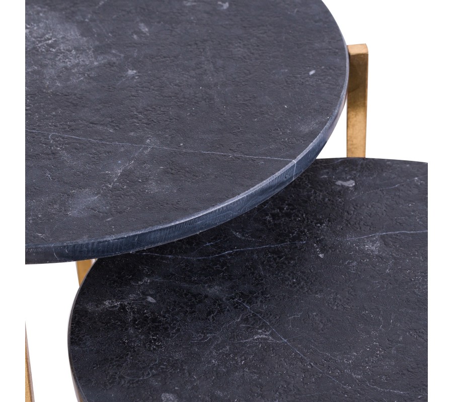 Dizajnový set dvoch príručných stolík Barrela je skvelým kúskom vhodným najmä do moderných či art-deco ladených interiérov. Stolíky sú zaujímavé najmä vďaka svojím doskám z mramoru v čiernej farbe, ktorých kruhový tvar pôsobí skutočne elegantne a dizajnovo. Čierna farba je kombinovaná zlatou konštrukciou z kovu, ktorá zabezpečuje skvelú stabilitu a zároveň umocňuje art-deco vzhľad stolíkov. Príručné stolíky možno využiť v luxusných obývacích izbách, ideálne vyniknú v kombinácii so svetlými farbami a modernými kovovými doplnkami. Pre zjemnenie odporúčame napríklad kombináciu s mäkkými kobercami či rastlinkami v dizajnových črepníkoch.