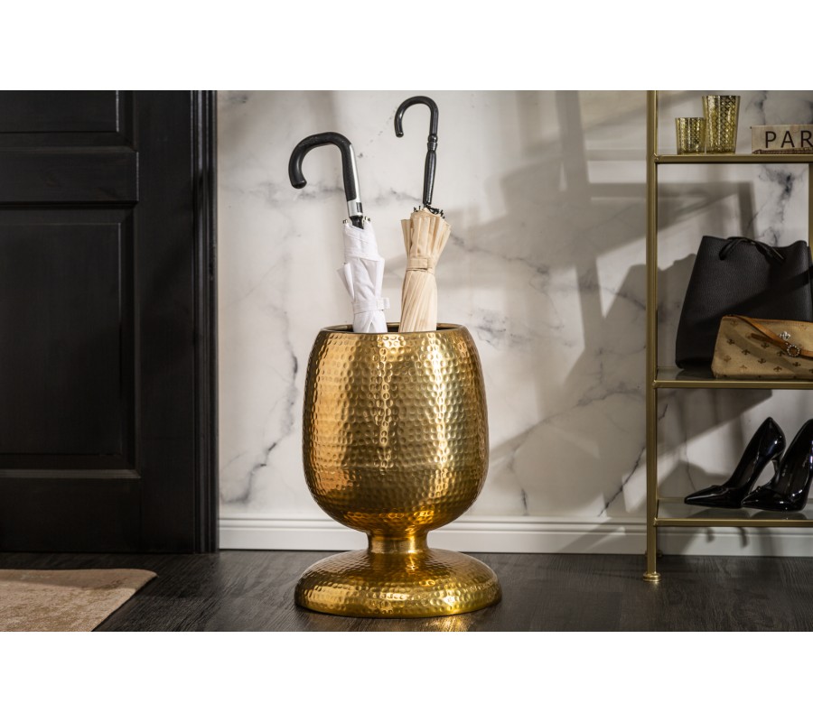 Jedinečný príručný stolík Siliguri v sebe spája moderný dizajn a lesklé čaro orientu. Dynamický organický tvar je doplnený výrazným dekoratívnym prvkom v podobe jamiek kladivkového povrchu, ktorý je výsledkom ručnej práce a každý kus kolekcie sa tak stáva jedinečným. Hliníková konštrukcia v zlatom prevedení skvele doplní moderné, orientálne prvky a nestratí sa ani v spoločnosti luxusných Art-deco doplnkov. Pre vytvorenie pútavého zátišia odporúčame príručný stolík Siliguri kombinovať s ďalšími prvkami našej rovnomennej kolekcie. Príručný stolík môžete použiť ako doplnkový odkladací priestor vo vašej obývačke, predsieni či spálni, dokonale vynikne v spoločnosti čalúneného nábytku v honosných poťahoch zo zamatu. Okrem kruhovej odkladacej plochy môžete produkt Siliguri po otočení a využívať ako stojan na dáždniky či ako vázu na kvetinové dekorácie.
