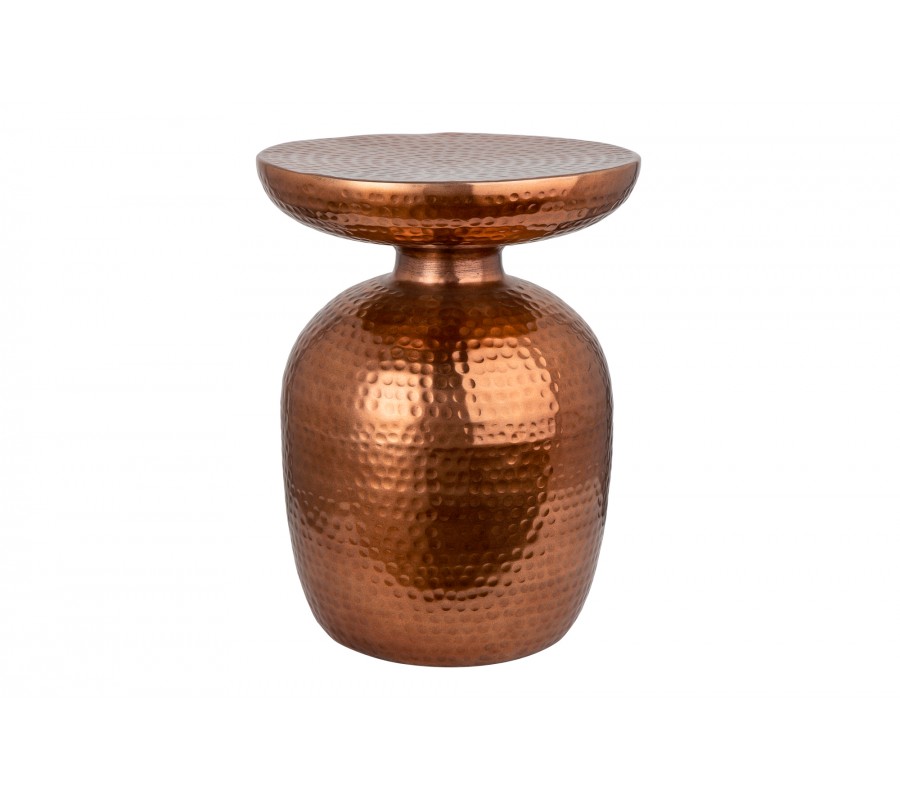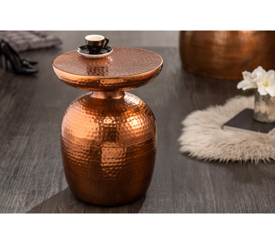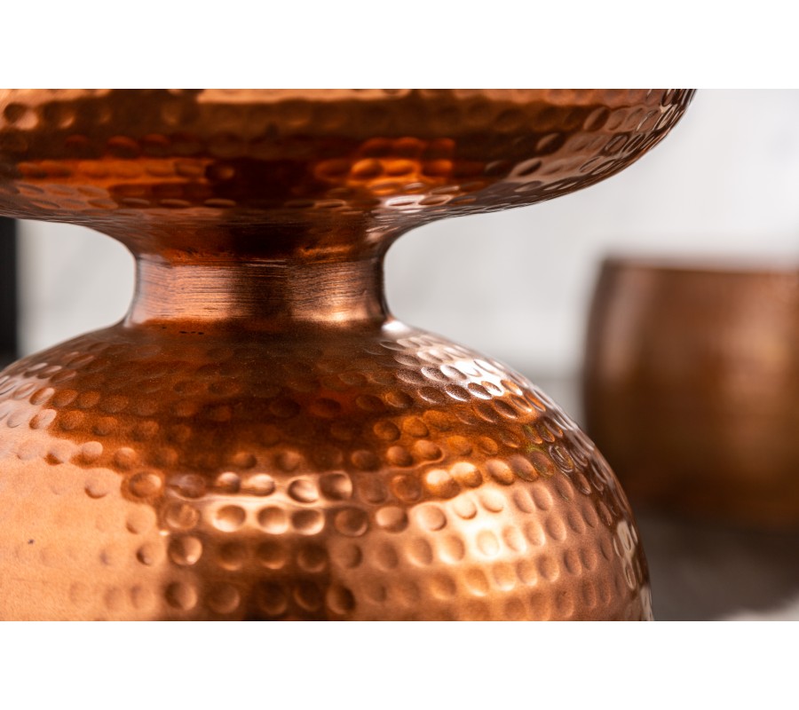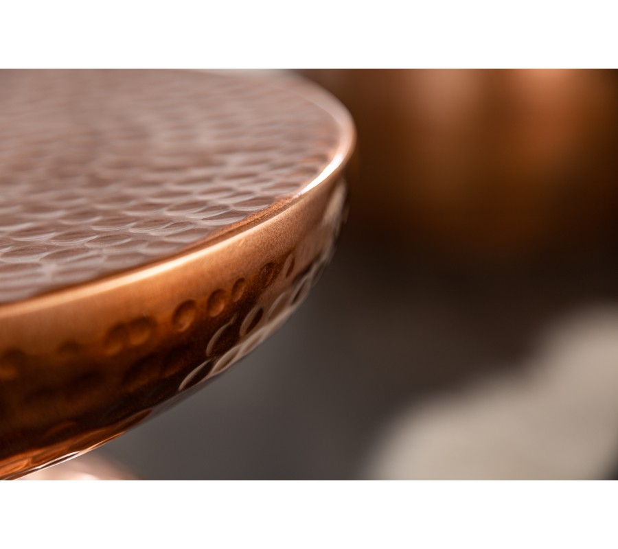 Jedinečný príručný stolík Siliguri v sebe spája moderný dizajn a lesklé čaro orientu. Dynamický organický tvar je doplnený výrazným dekoratívnym prvkom v podobe jamiek kladivkového povrchu, ktorý je výsledkom ručnej práce a každý kus kolekcie sa tak stáva jedinečným. Hliníková konštrukcia v medenom prevedení skvele doplní moderné, orientálne prvky a nestratí sa ani v spoločnosti luxusných Art-deco doplnkov. Pre vytvorenie pútavého zátišia odporúčame príručný stolík Siliguri kombinovať s ďalšími prvkami našej rovnomennej kolekcie. Príručný stolík môžete použiť ako doplnkový odkladací priestor vo vašej obývačke, predsieni či spálni, dokonale vynikne v spoločnosti čalúneného nábytku v honosných poťahoch zo zamatu. Okrem kruhovej odkladacej plochy môžete produkt Siliguri po otočení a využívať ako stojan na dáždniky, podstavec či ako vázu na kvetinové dekorácie.