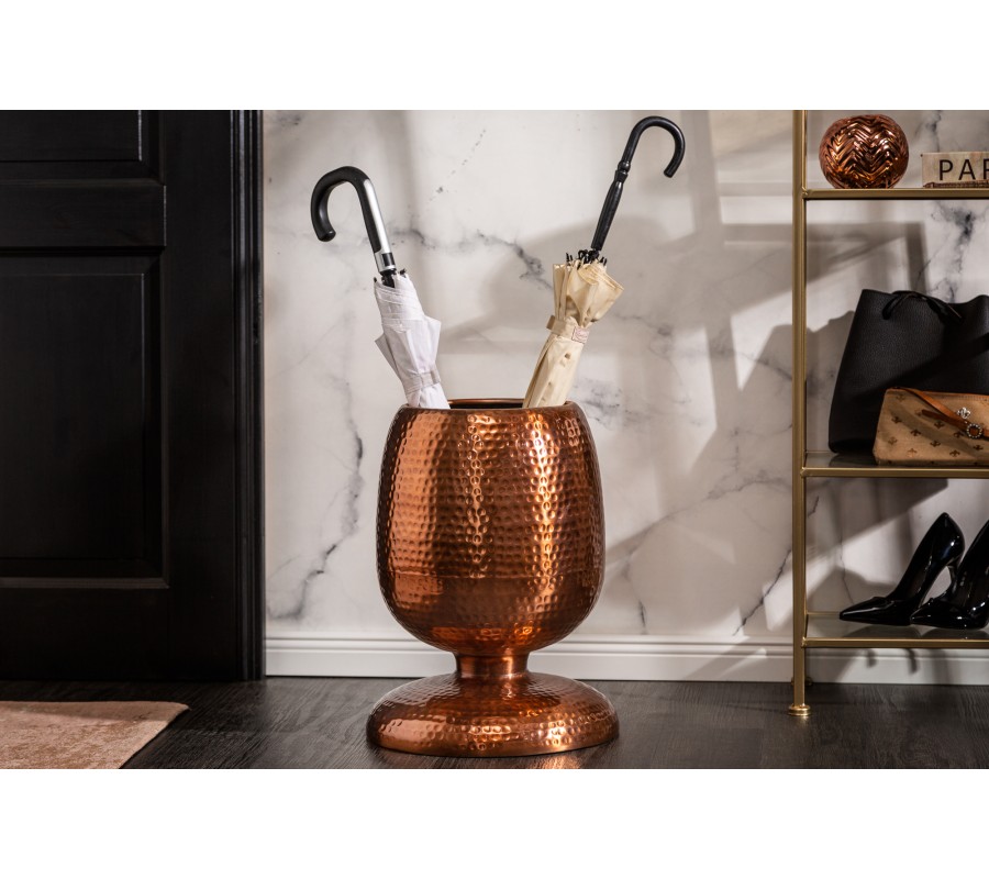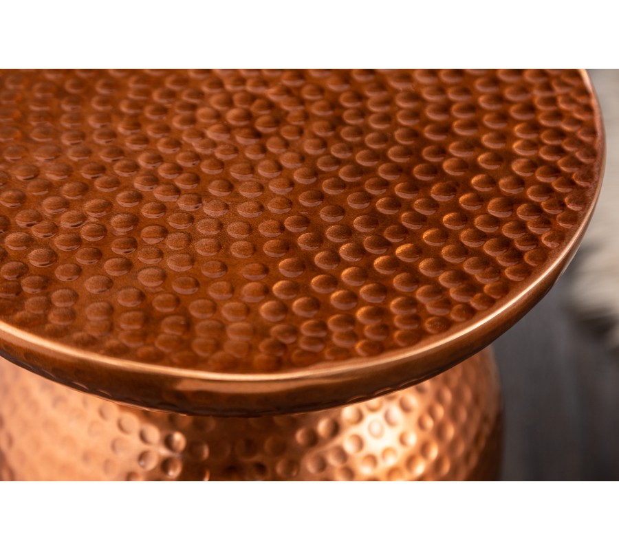 Moderný okrúhly medený príručný stolík so stojanom na dáždniky Siliguri s tepaným povrchom 36cm