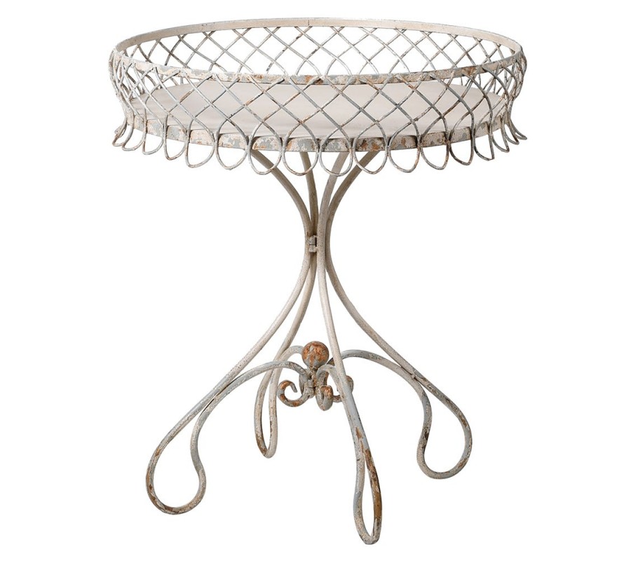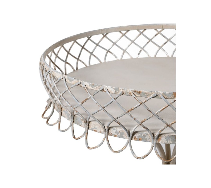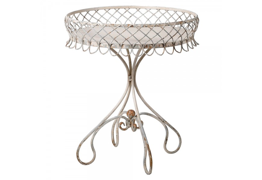 Jedinečný povrch príručného stolíka Dovey očarí každého milovníka provensálskeho či vintage štýlu. Praktická kruhová doska je doplnená kovovou dekoratívnou obručou, ktorá okrem estetickej funkcie chráni odkladané predmety pred pošmyknutím. Podstava stola sa nesie v rovnako dekoratívnom duchu a celkový dizajn príručného stolíka dotvára ladnými krivkami. Tento jedinečný kúsok sa nestratí v žiadnom interiéri s bledými provensálskymi prvkami a nábytkom v obľúbenom vintage štýle. Skvele vynikne v kombinácii s motívom lúčnych kvetov a prírodnými odtieňmi dreva.